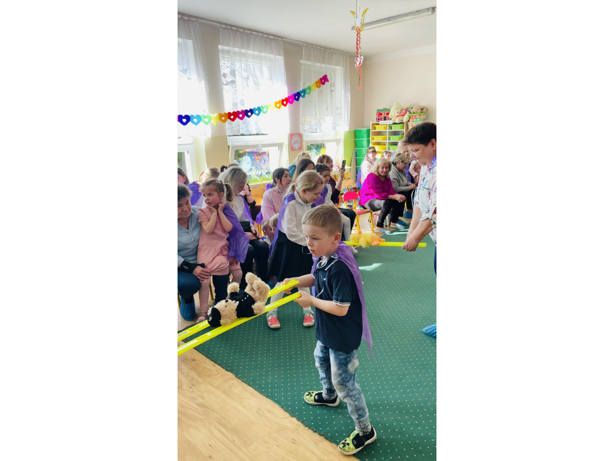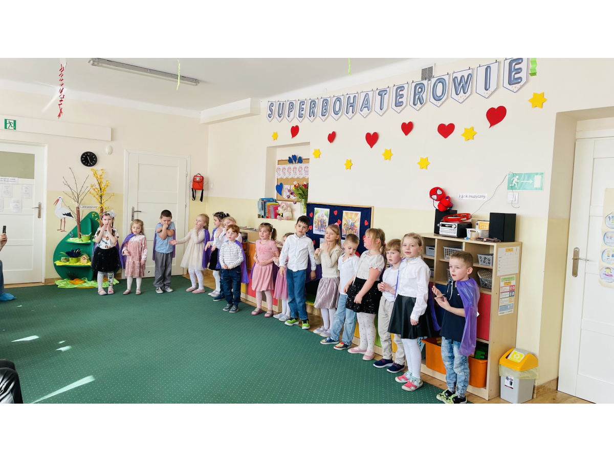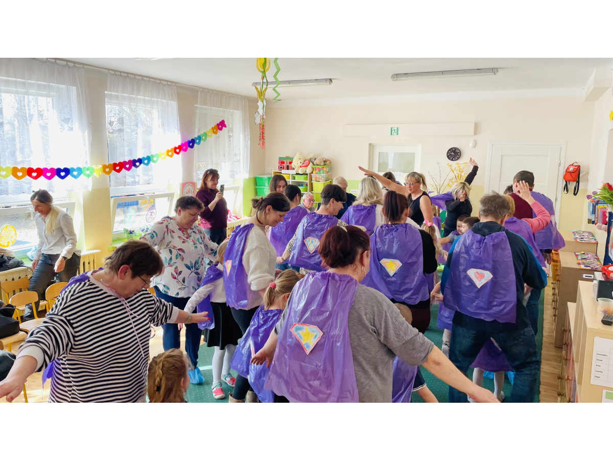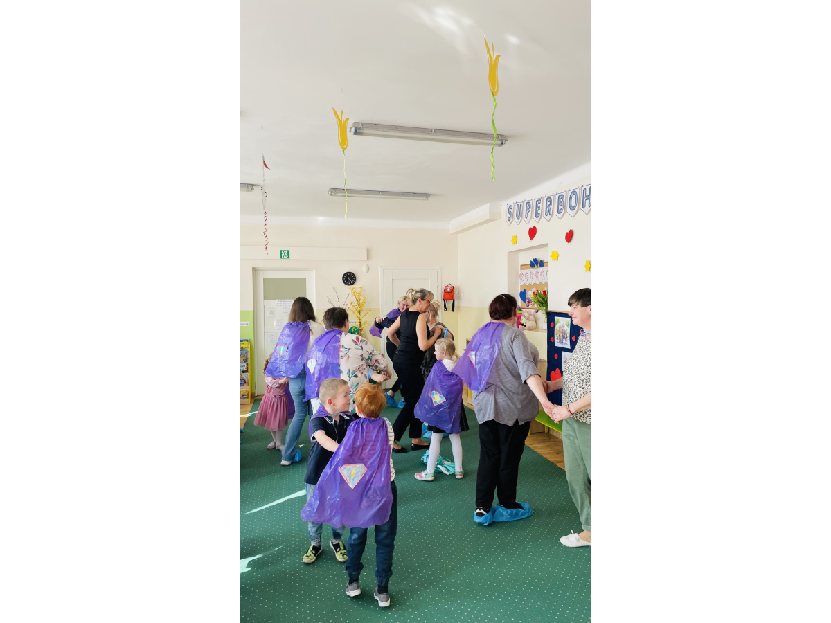 Wszyscy razem zdobywali supermoce, wykonując różnorodne, ciekawe zadania, co przyniosło mnóstwo śmiechu i wzruszeń. Na zakończenie goście otrzymali piękne upominki przygotowane przez dzieci a wspólne świętowanie dopełnił słodki poczęstunek – babeczki symbolizujące najważniejszą supermoc: bliskość. To był naprawdę cudowny i niezapomniany dzień dla wszystkich uczestników.