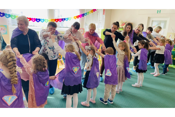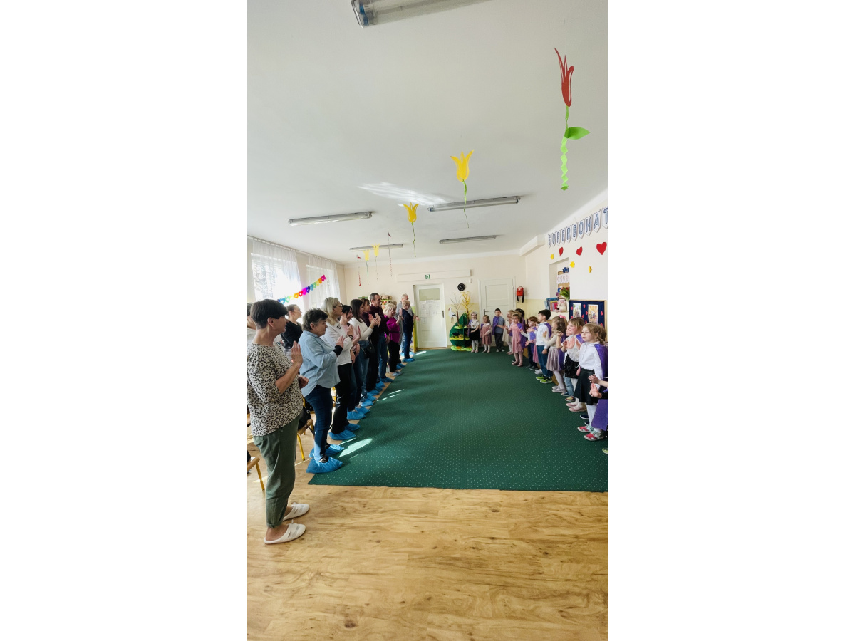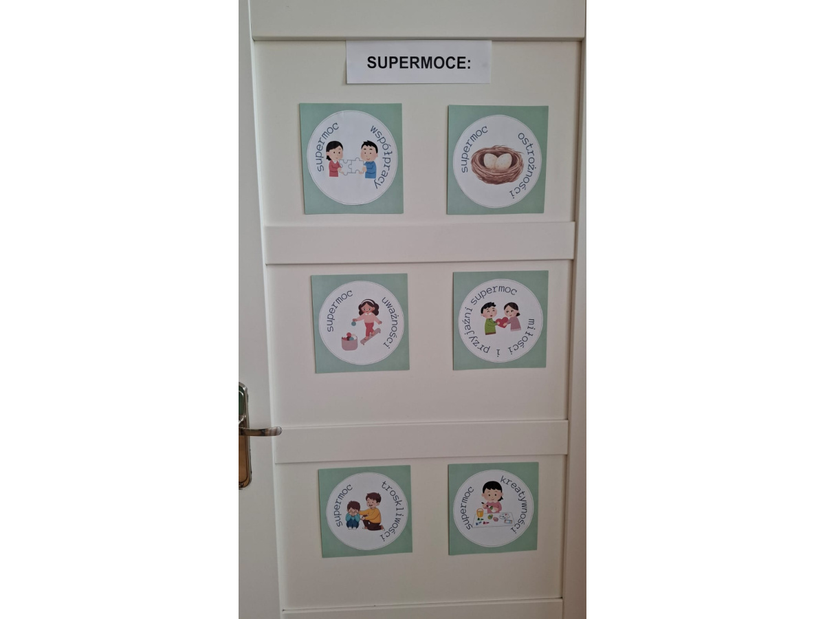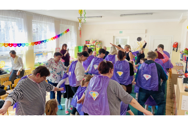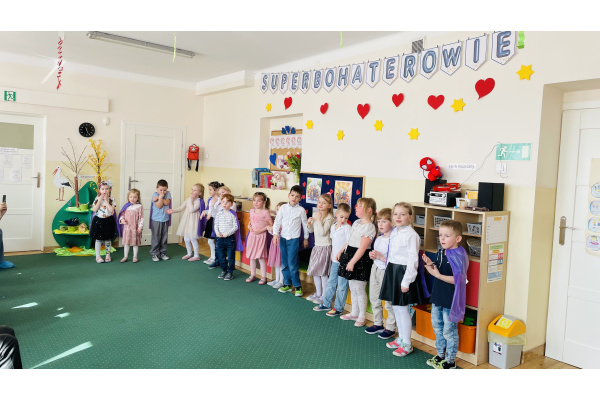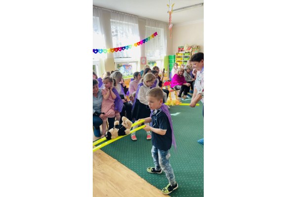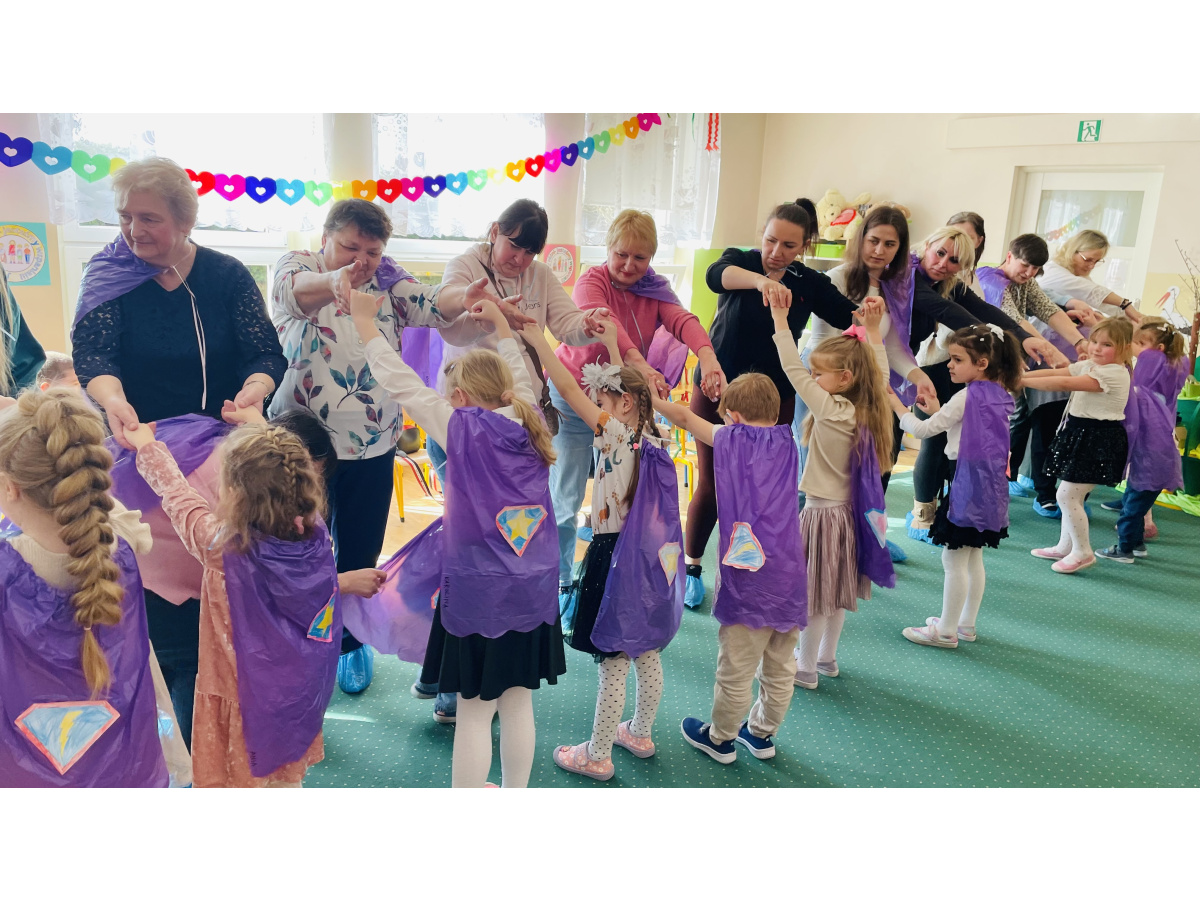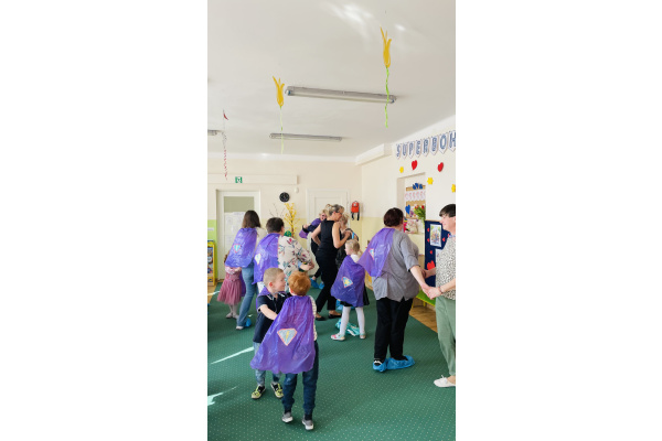 Wszyscy razem zdobywali supermoce, wykonując różnorodne, ciekawe zadania, co przyniosło mnóstwo śmiechu i wzruszeń. Na zakończenie goście otrzymali piękne upominki przygotowane przez dzieci a wspólne świętowanie dopełnił słodki poczęstunek – babeczki symbolizujące najważniejszą supermoc: bliskość. To był naprawdę cudowny i niezapomniany dzień dla wszystkich uczestników.