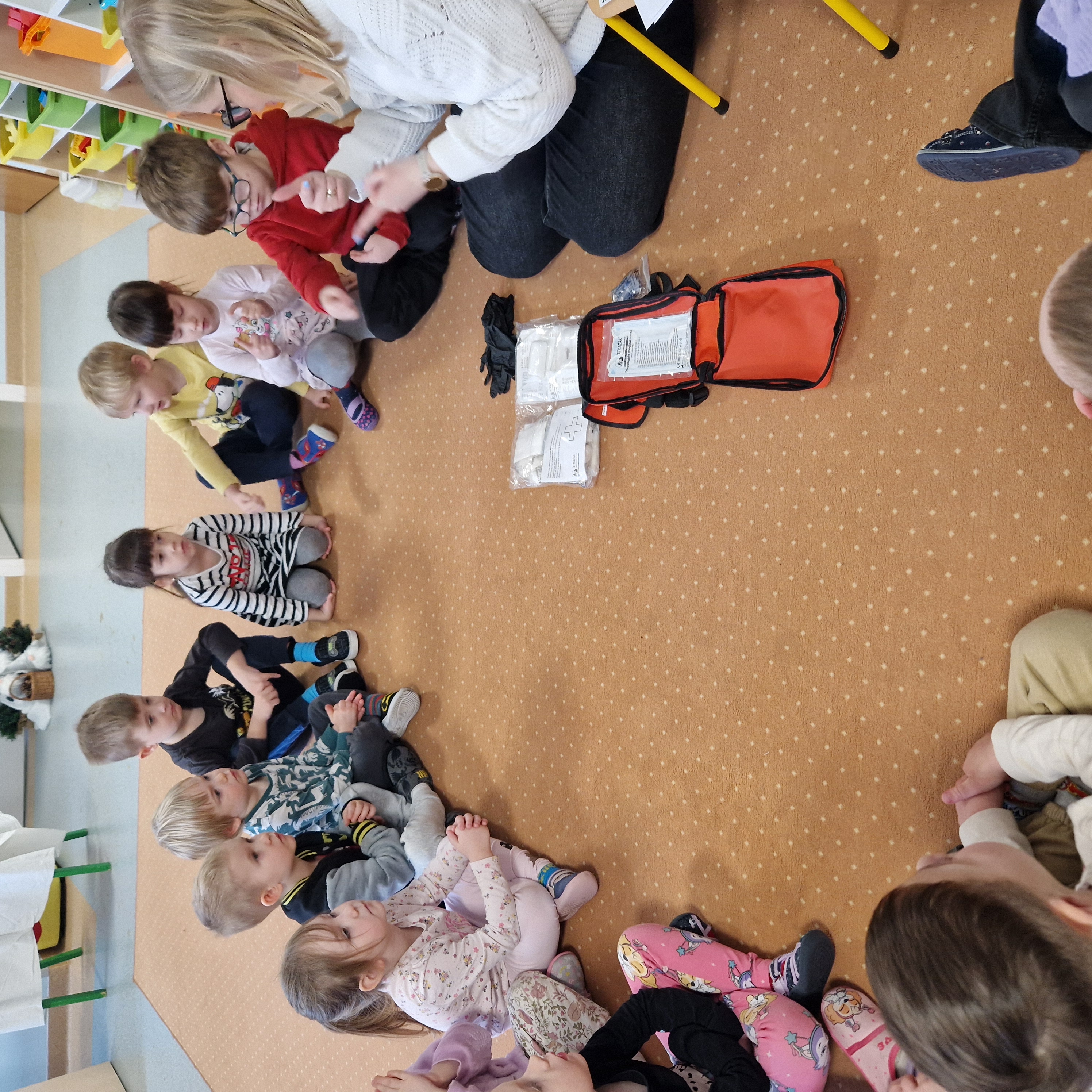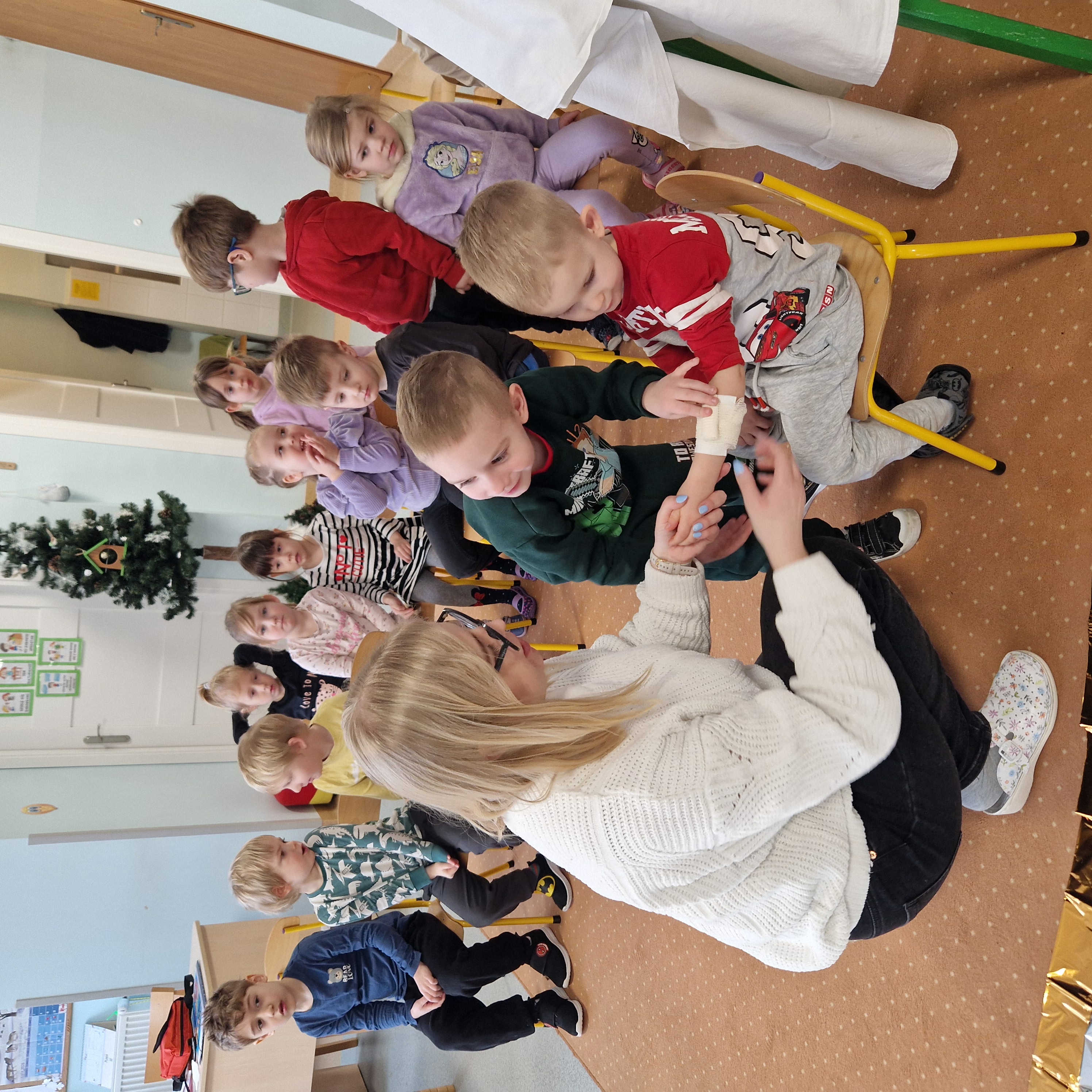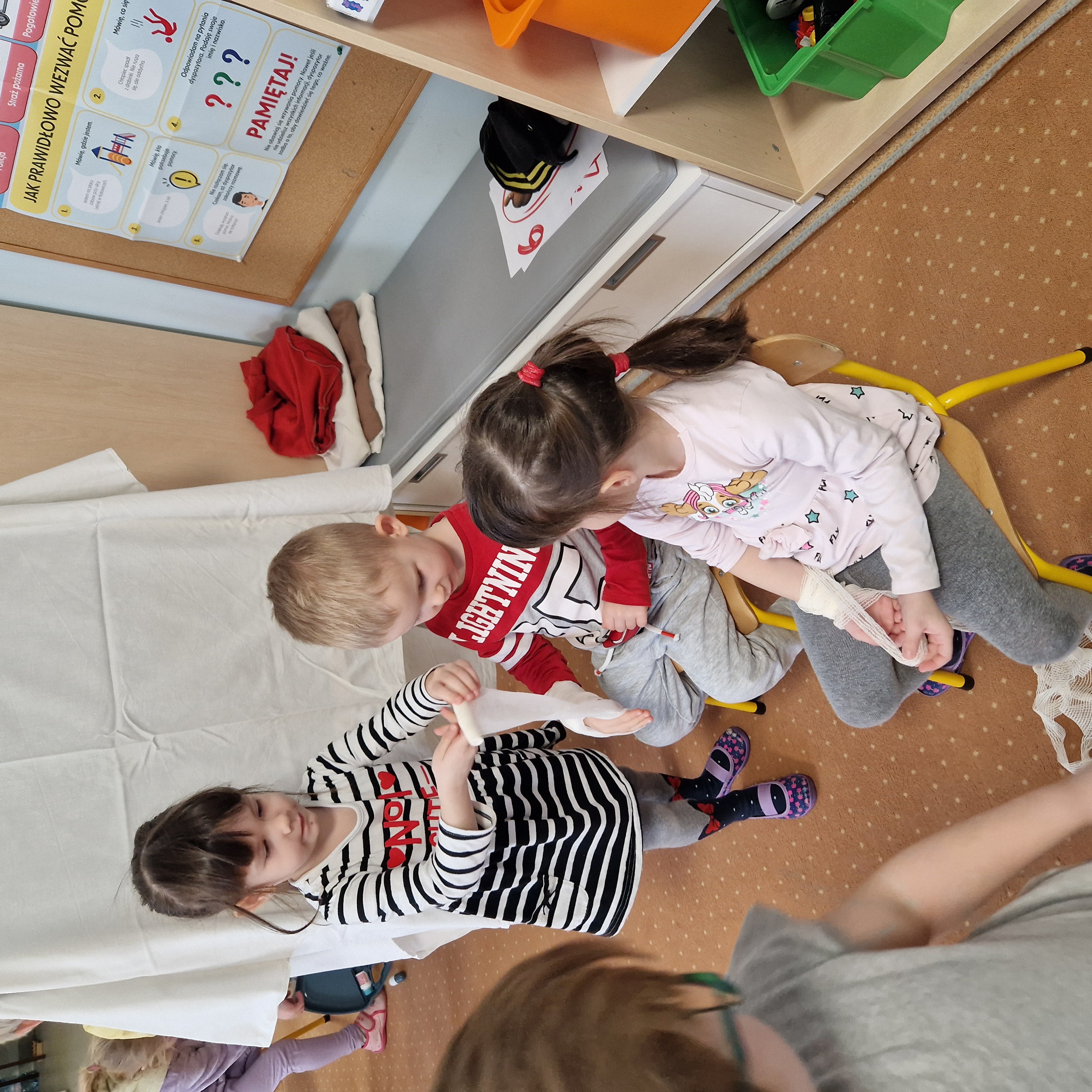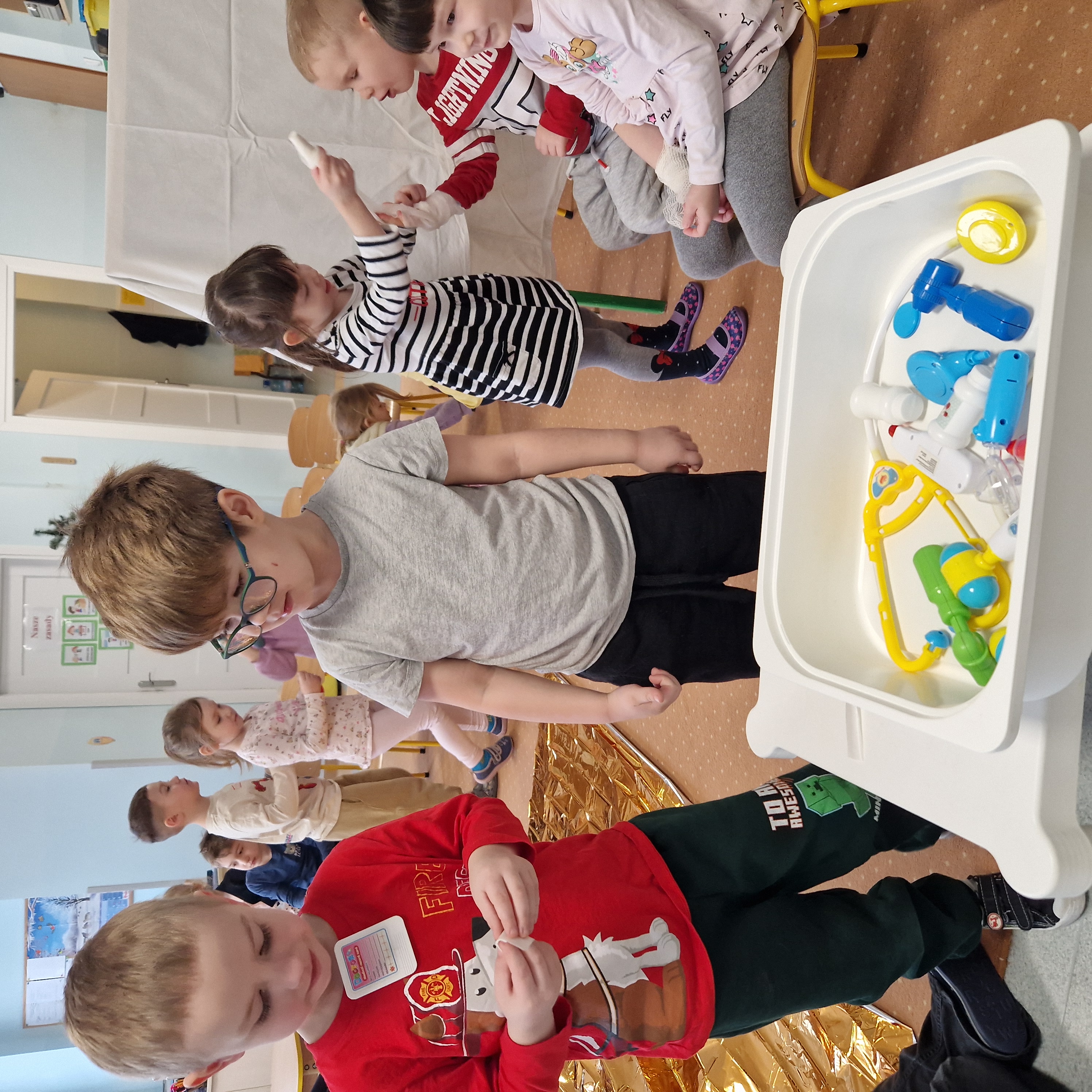 Grupa II obchodziła Dzień Pierwszej Pomocy realizując drugie zadanie projektu. Dzieci poznały numery alarmowe, dowiedziały się, czym jest pozycja boczna bezpieczna oraz w jaki sposób należy udzielać pierwszej pomocy. W sali powstał kącik pierwszej pomocy i poczekalnia, gdzie dzieci odgrywały rolę lekarza lub pacjenta. To był bardzo pouczający i wyjątkowy dzień!