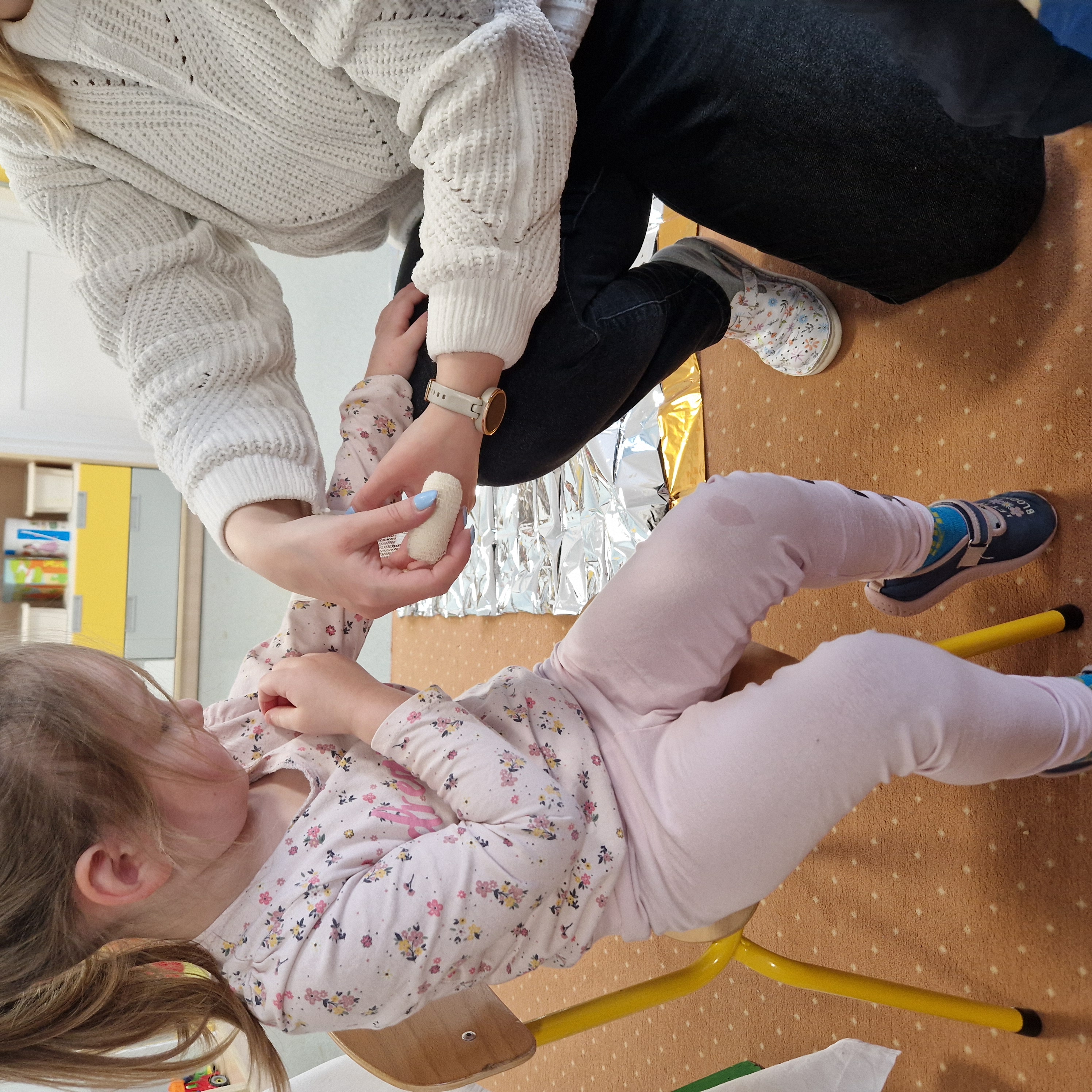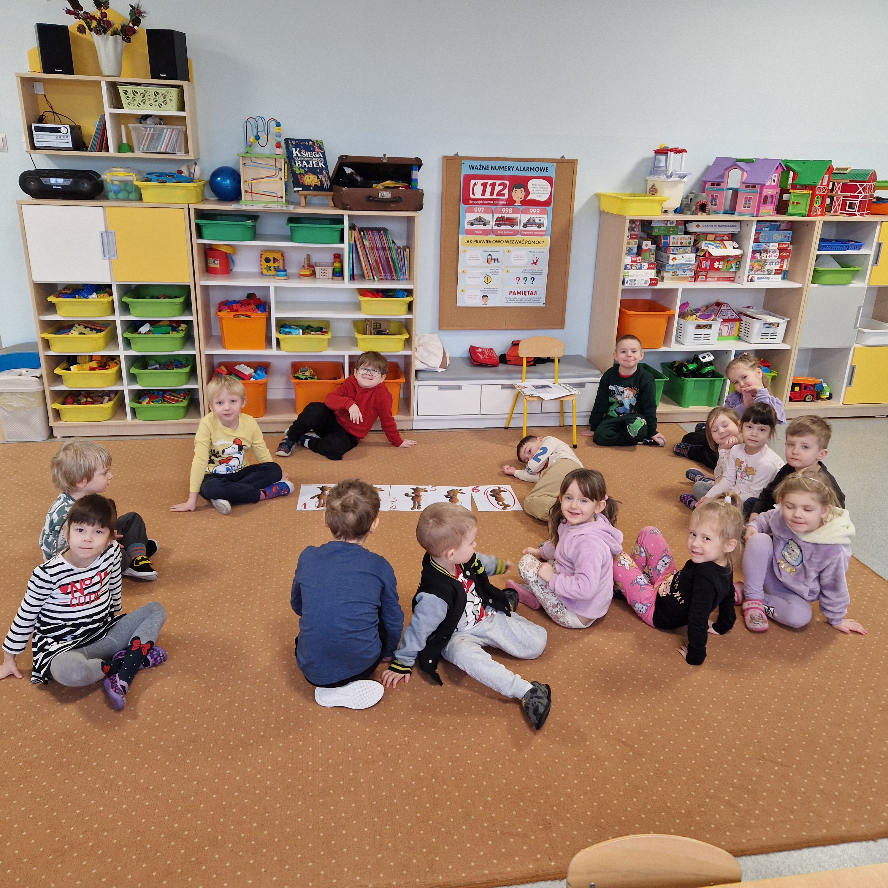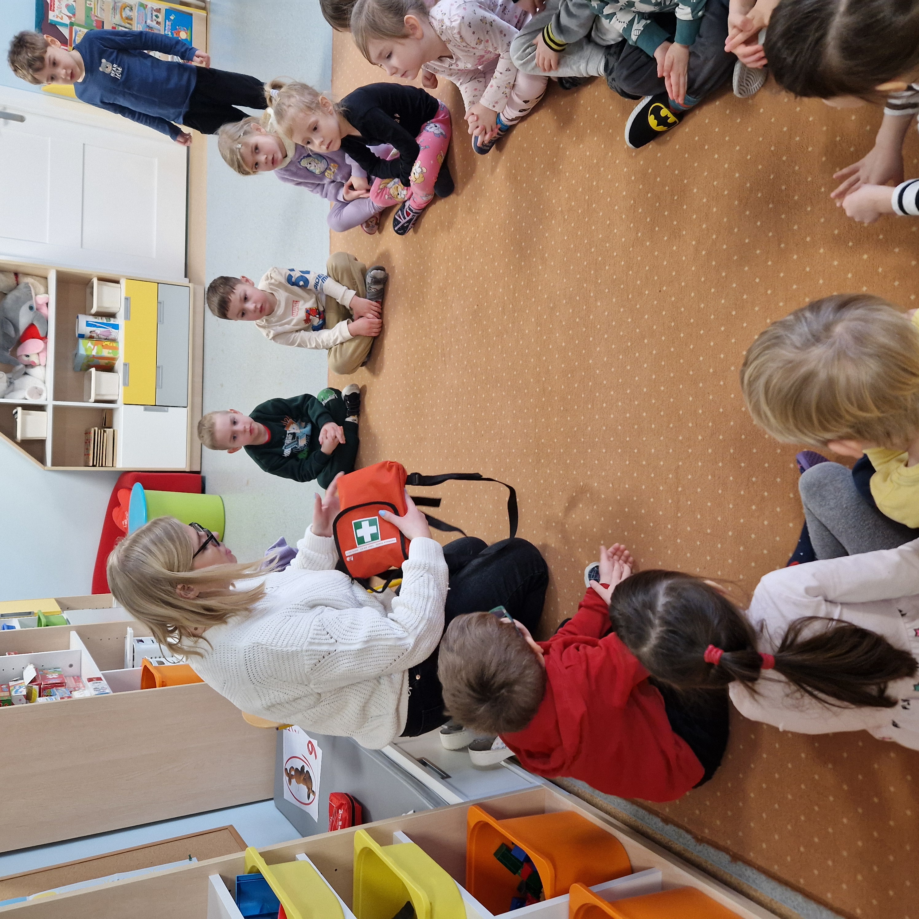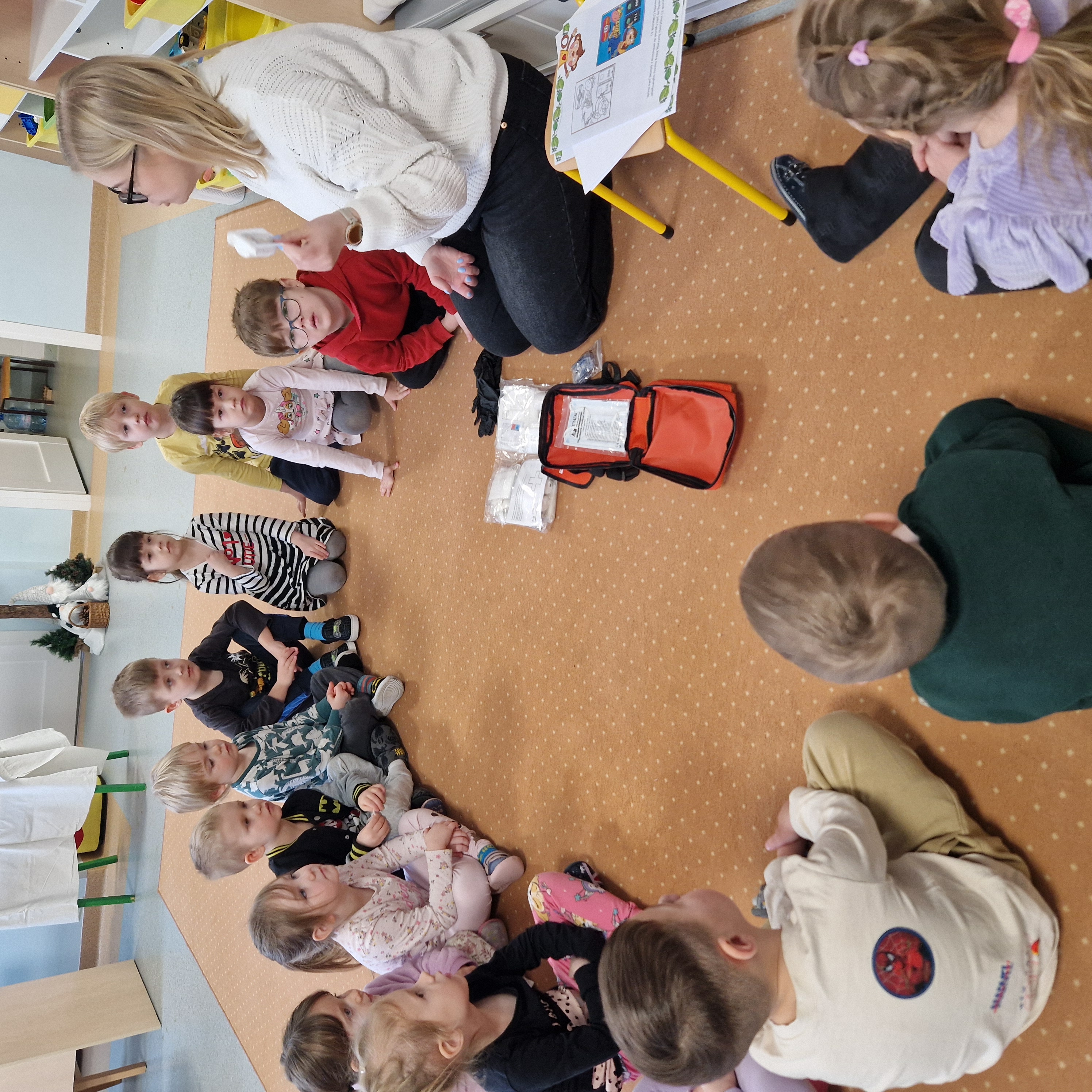 Grupa II obchodziła Dzień Pierwszej Pomocy realizując drugie zadanie projektu. Dzieci poznały numery alarmowe, dowiedziały się, czym jest pozycja boczna bezpieczna oraz w jaki sposób należy udzielać pierwszej pomocy. W sali powstał kącik pierwszej pomocy i poczekalnia, gdzie dzieci odgrywały rolę lekarza lub pacjenta. To był bardzo pouczający i wyjątkowy dzień!