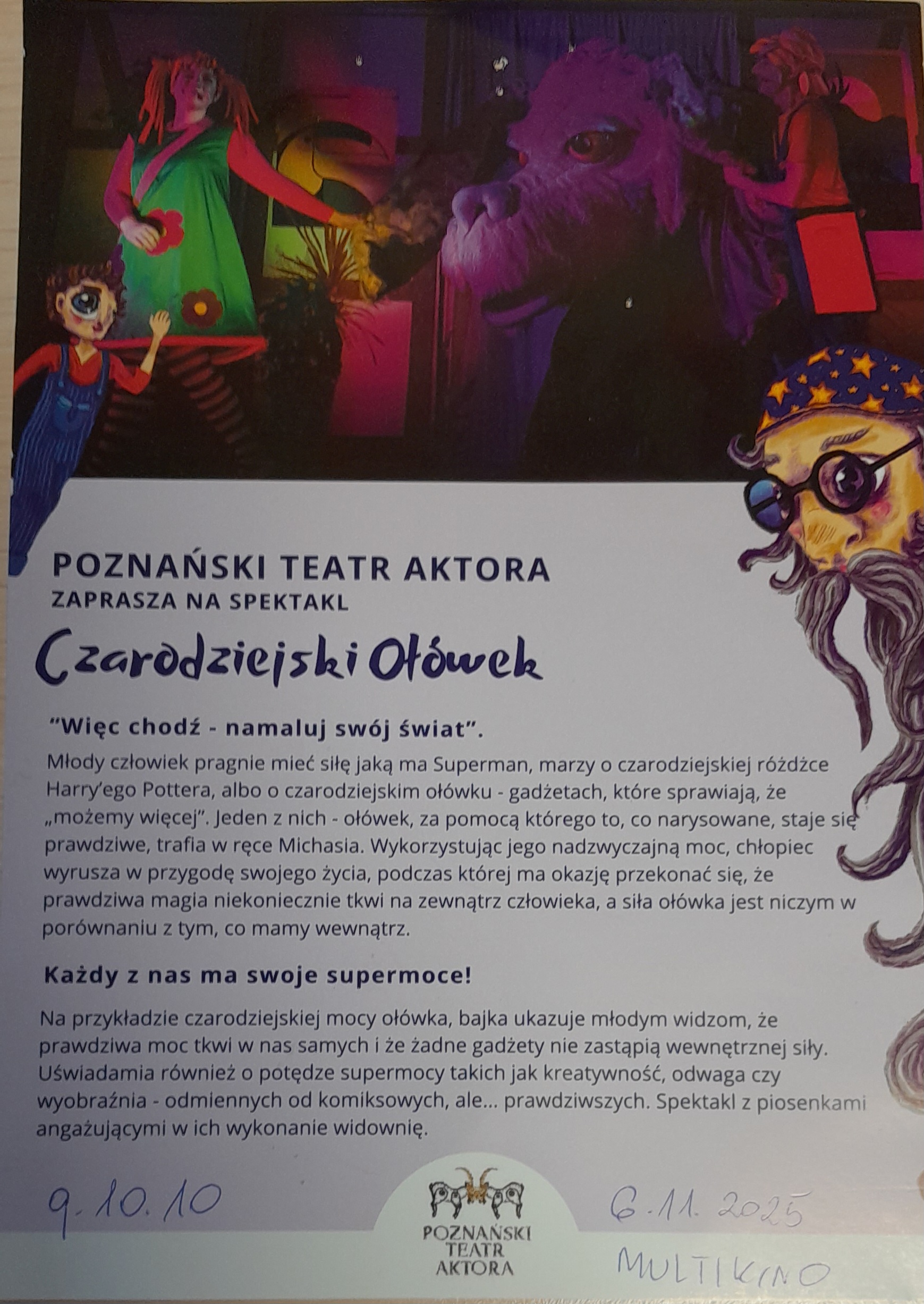 Dnia 6 listopada grupy I, IV, V, VI i VII uczestniczyły w spektaklu przygotowanym przez Poznański Teatr Aktora pt "Czarodziejski ołówek". Bajka ukazuje małym widzom prawdziwą moc, która tkwi w nas samych. Są to: odwaga, wyobraźnia, kreatywność, zrozumienie dla innych. Spektakl jest urozmaicony piosenkami angażującymi widownię. Nasze dzieci aktywnie uczestniczyły w przedstawieniu i czerpały radość ze wspólnej zabawy.