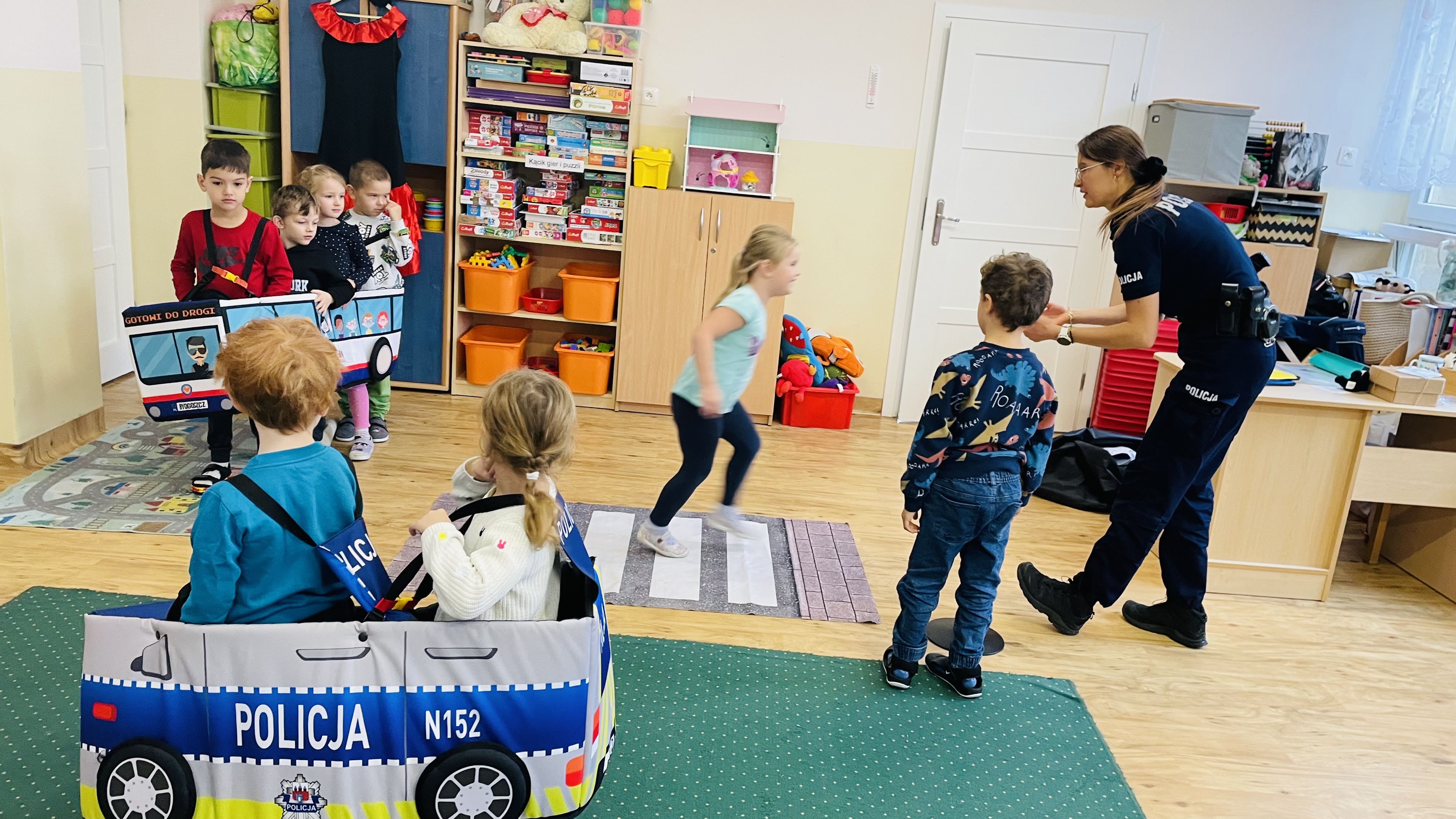 Nasza grupa uczestniczyła w spotkaniu z policjantem. W trakcie spotkania dzieci miały okazję sprawdzić swoją wiedzę na temat bezpieczeństwa na drodze, a także czynnie brać udział w zabawie "Ruch uliczny".
