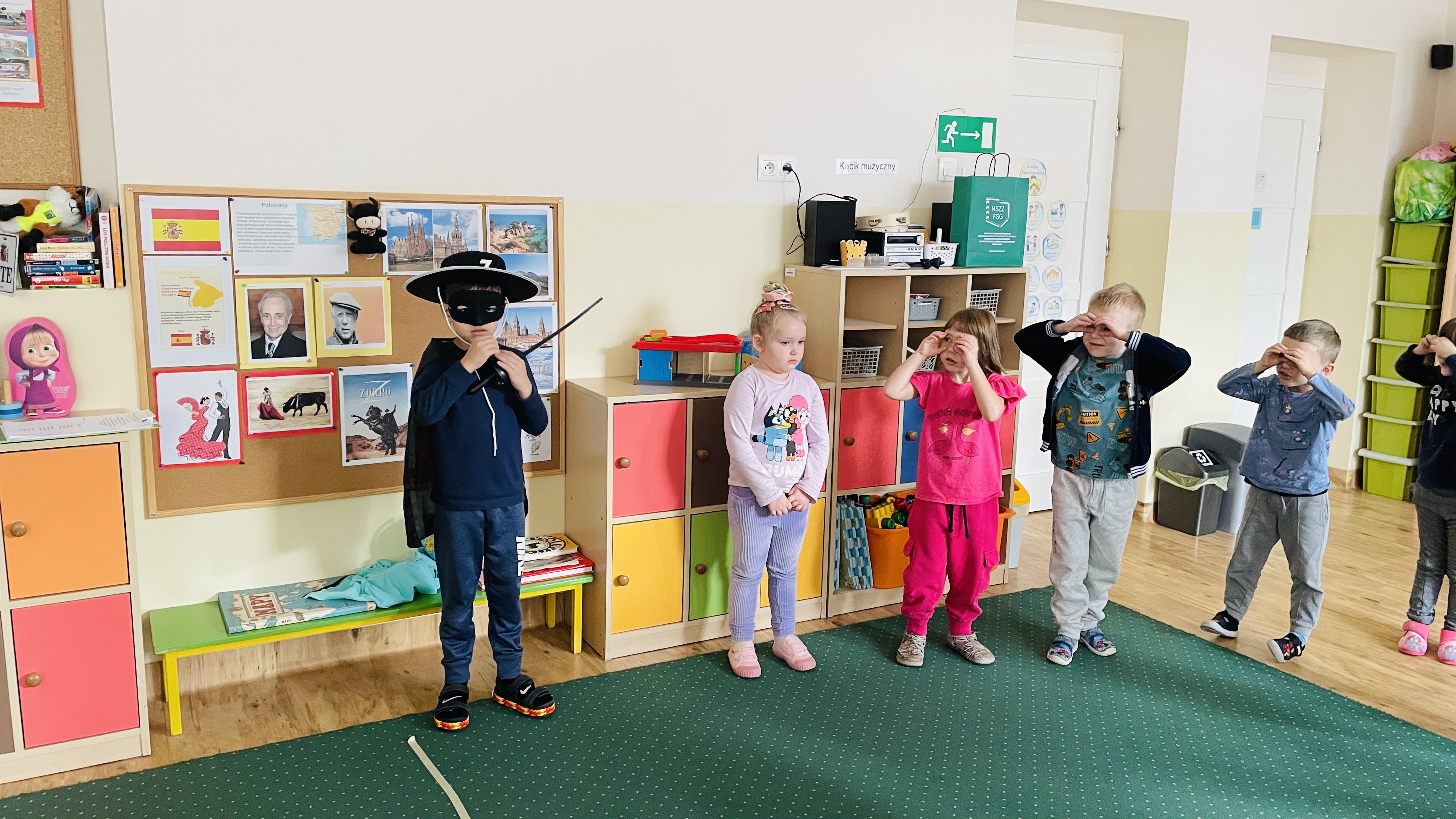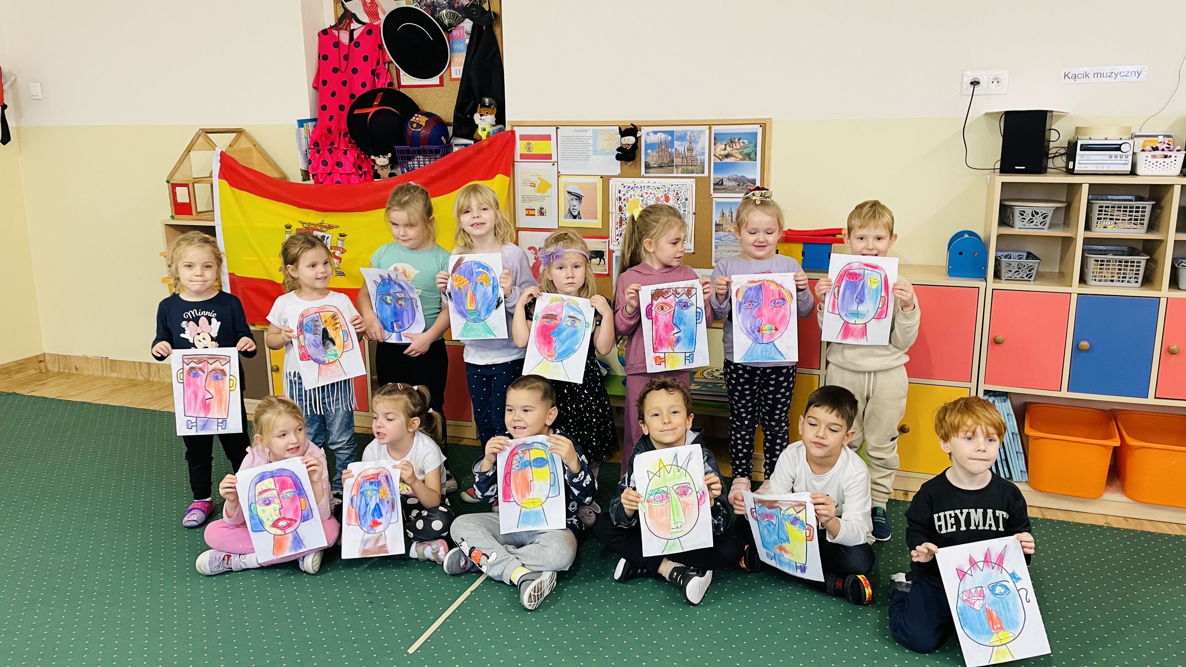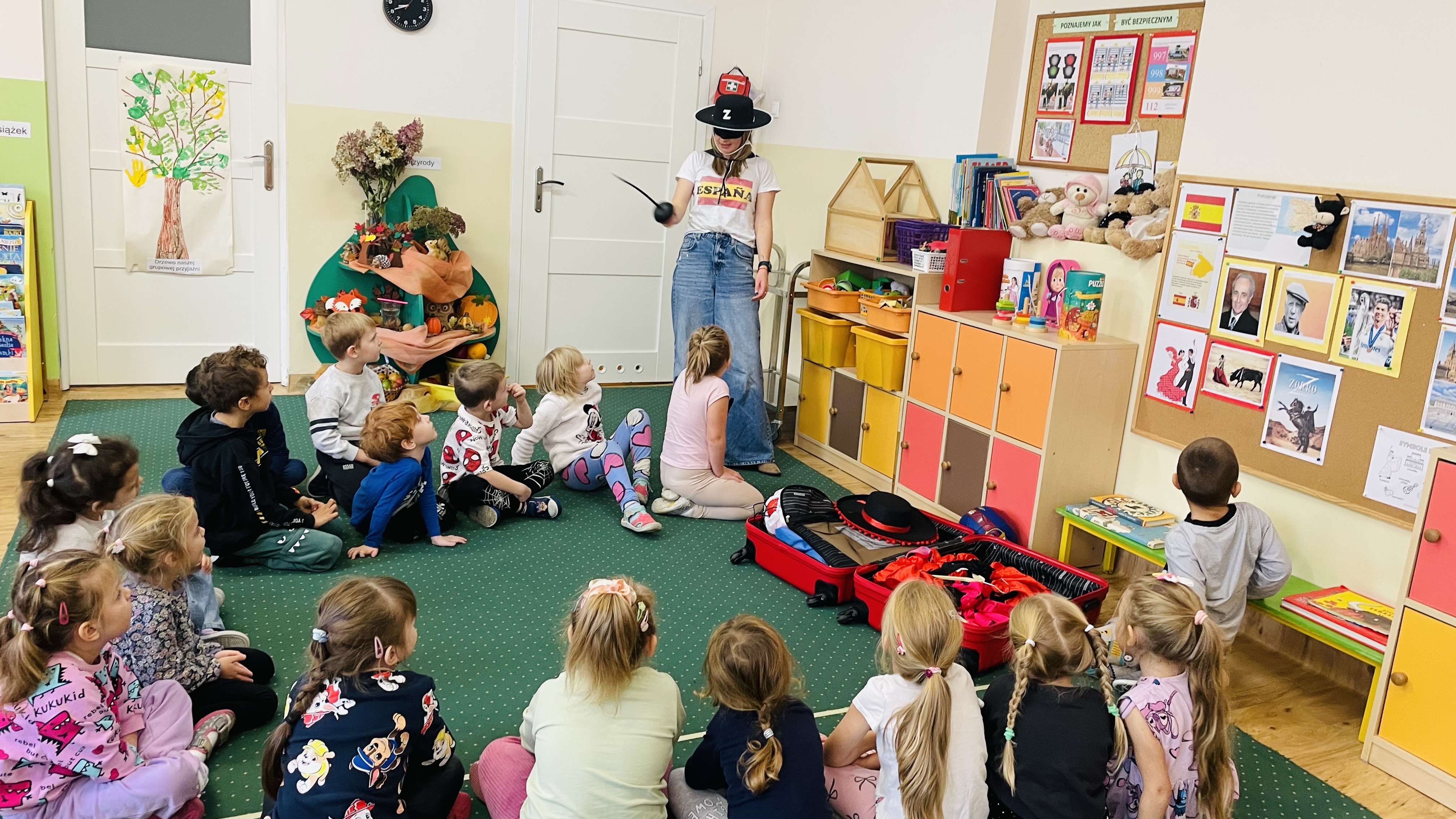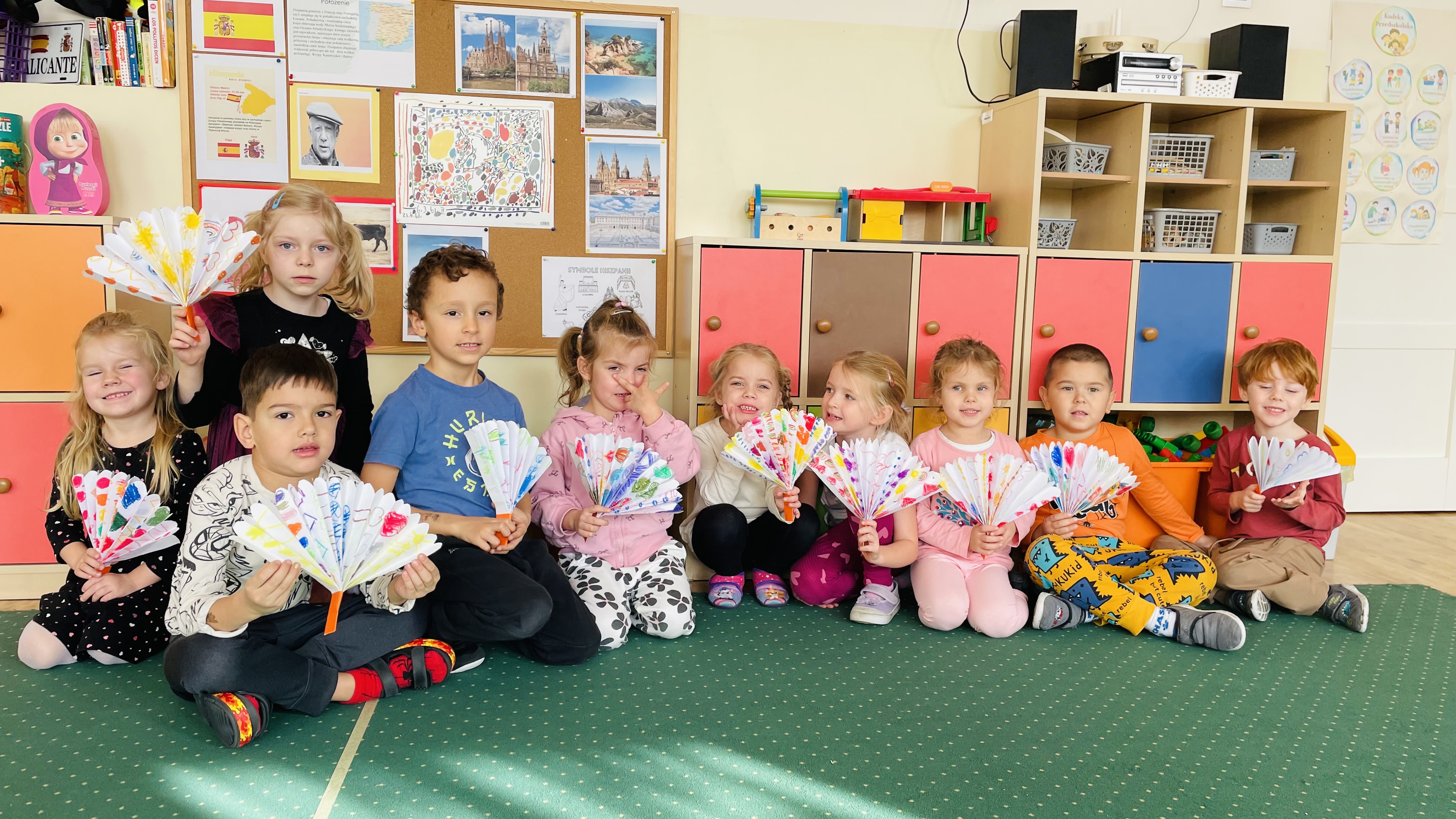 Nasza grupa realizowała miejski projekt edukacyjny „Walizka z podróży- Hiszpania”, którego celem jest budowanie postawy tolerancji i akceptacji wśród najmłodszych. Dzięki udziałowi w projekcie dzieci poznały kulturę Hiszpanii, położenie geograficzne, symbole narodowe, charakterystyczne potrawy, zwyczaje i muzykę. Mogły wcielić się w rolę charakterystycznych postaci, np. Zorro, piłkarzy ze znanych hiszpańskich klubów sportowych oraz naśladowały hiszpańskiego artystę P. Picasso - tworząc prace plastyczną wzorowaną jego dziełami. Dzięki wizycie gościa, pani Sary Jurkiewicz – nauczyciela języka hiszpańskiego w International School of Bydgoszcz, dzieci osłuchały się z brzmieniem języka, poznały hiszpańskie zabawy na powitanie oraz wzięły poznały hiszpańskie święto i zabawę „Tomatina”. Podziwiały hiszpańskie wachlarze i stroje tancerek flamenco oraz spróbowały tańczyć do muzyki flamenco. Wspólnie z nauczycielami dzieci tworzyły tematyczny kącik o Hiszpanii, w którym znalazły się pamiątki z Hiszpanii oraz książki dla dzieci w języku hiszpańskim. Na koniec dziewczynki i chłopcy poznali technikę składania kartki, tak aby powstał wachlarz i każdy wykonał wachlarz wg swojego pomysłu. To był tydzień pełen ciekawych zabaw i wspaniałych wrażeń.
