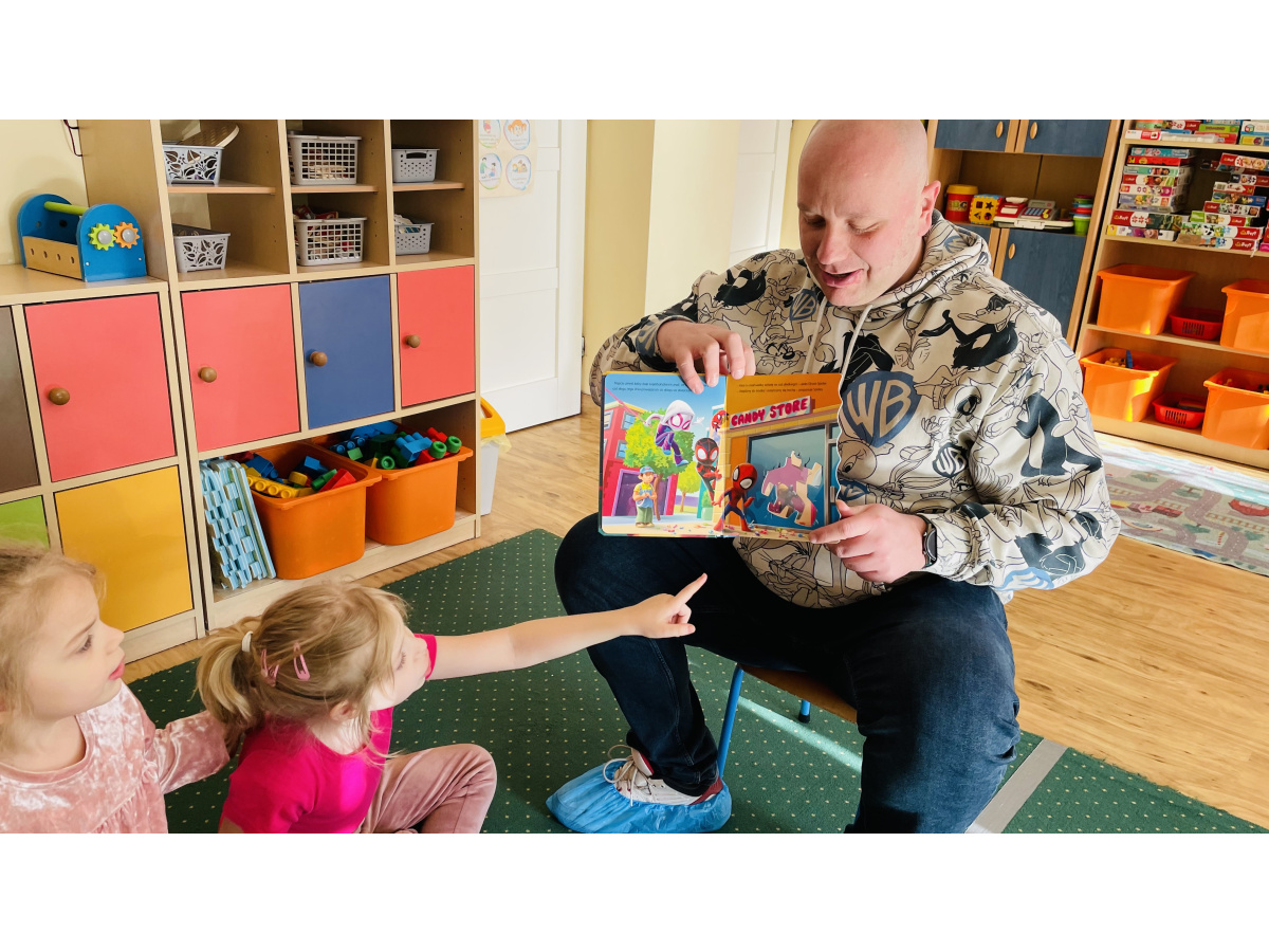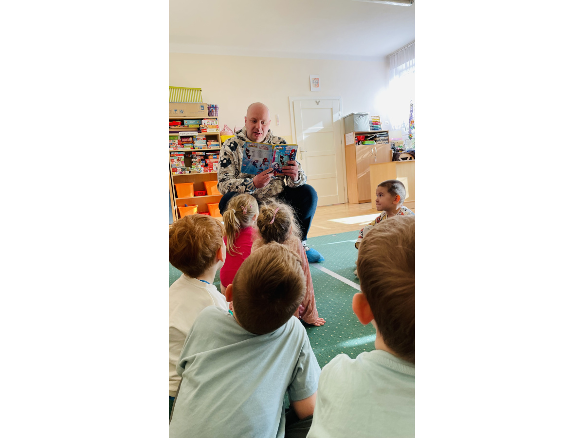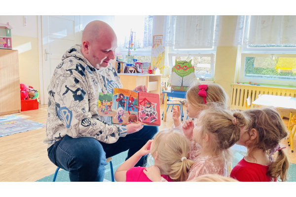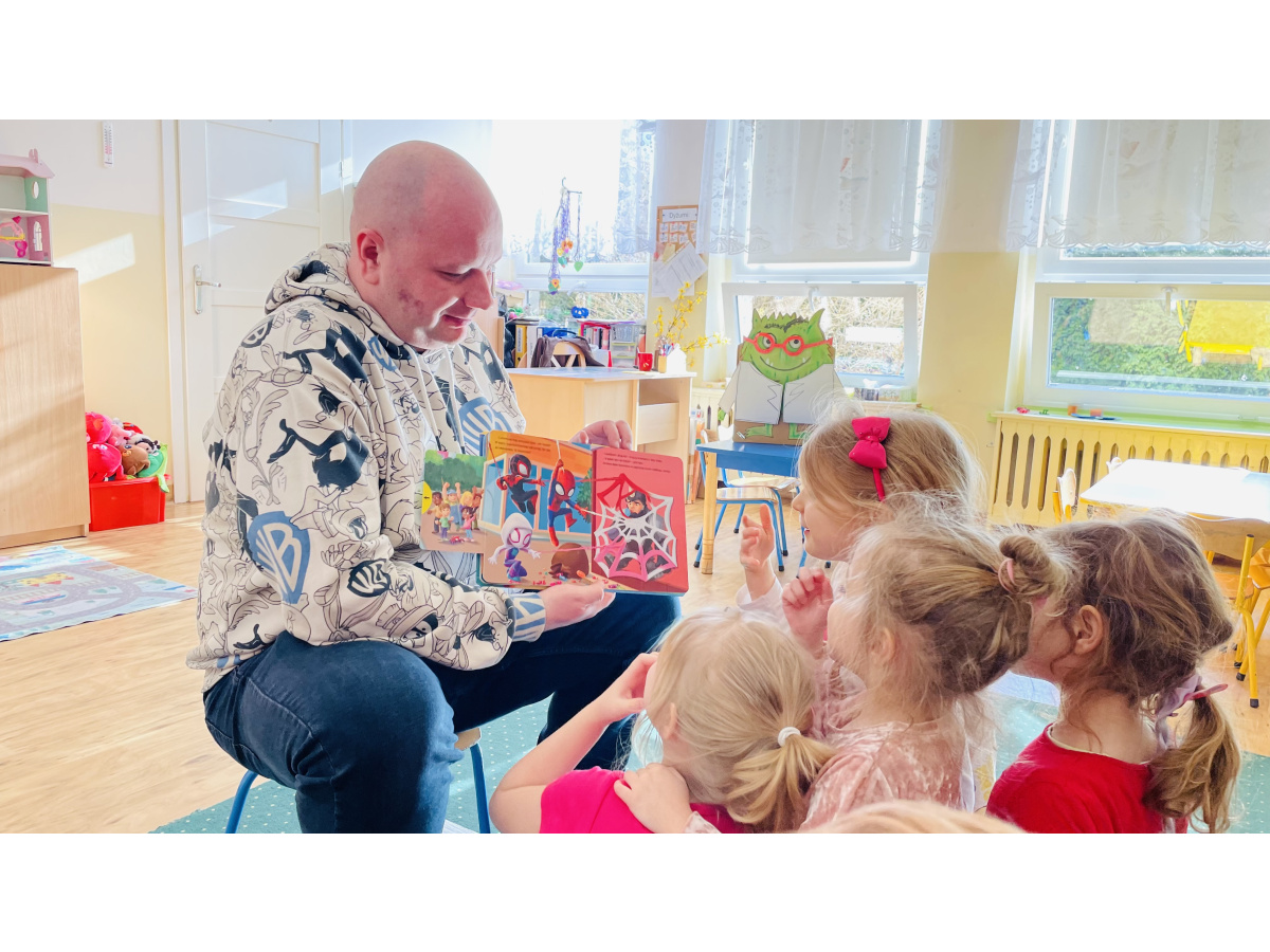 Do naszej grupowej akcji "Rodzice czytają dzieciom" włączył się pan Krzysztof, który wspólnie z Szymonem wybrał książkę do przeczytania grupie. Było to ilustrowane opowiadanie o przygodach Spidermana. Wszyscy byli zachwyceni, bo już za chwilkę rozpoczynaliśmy tematykę "Wszyscy jesteśmy superbohaterami – jesteśmy tolerancyjni, empatyczni i dbamy o relacje w naszej grupie”