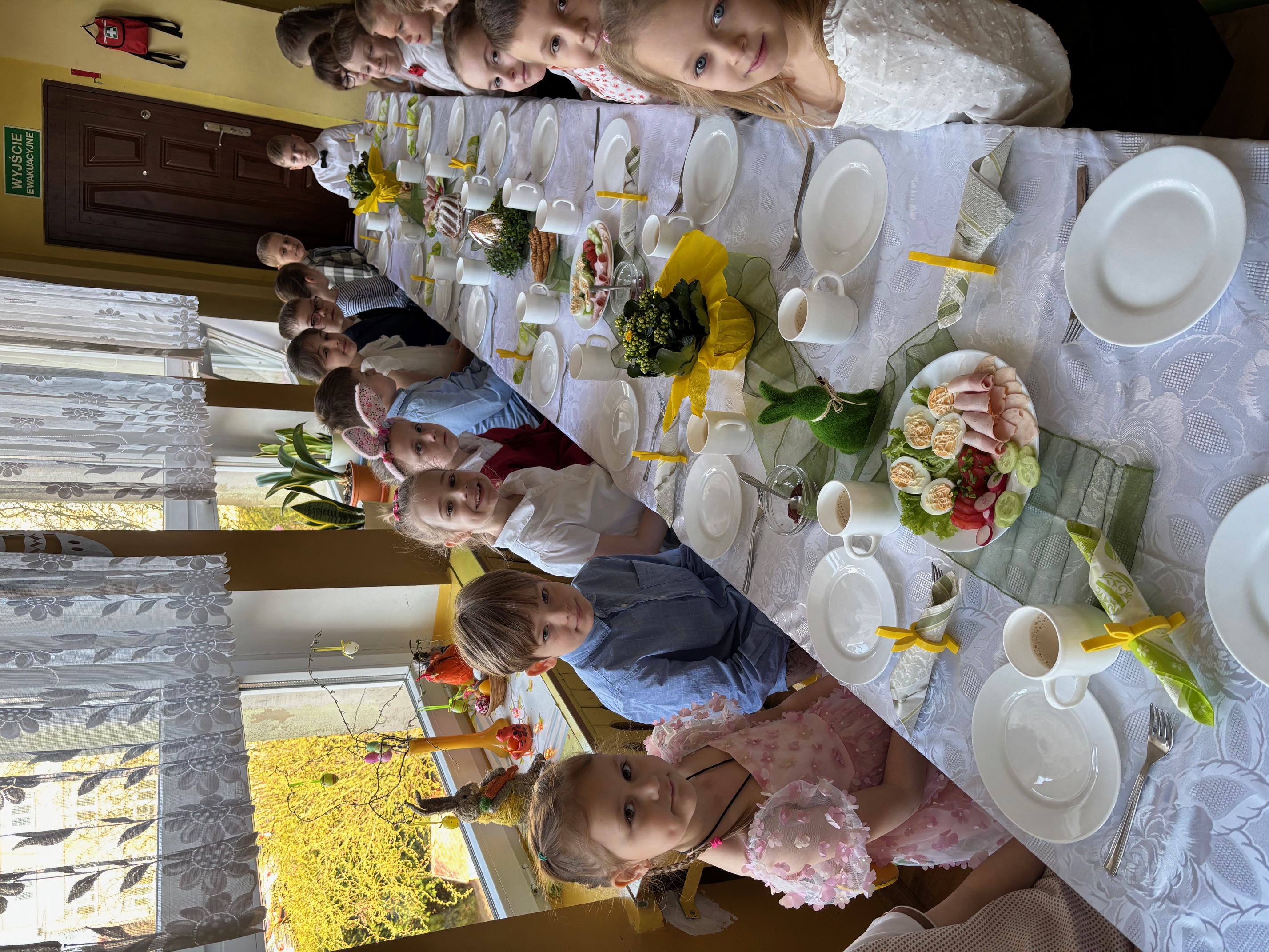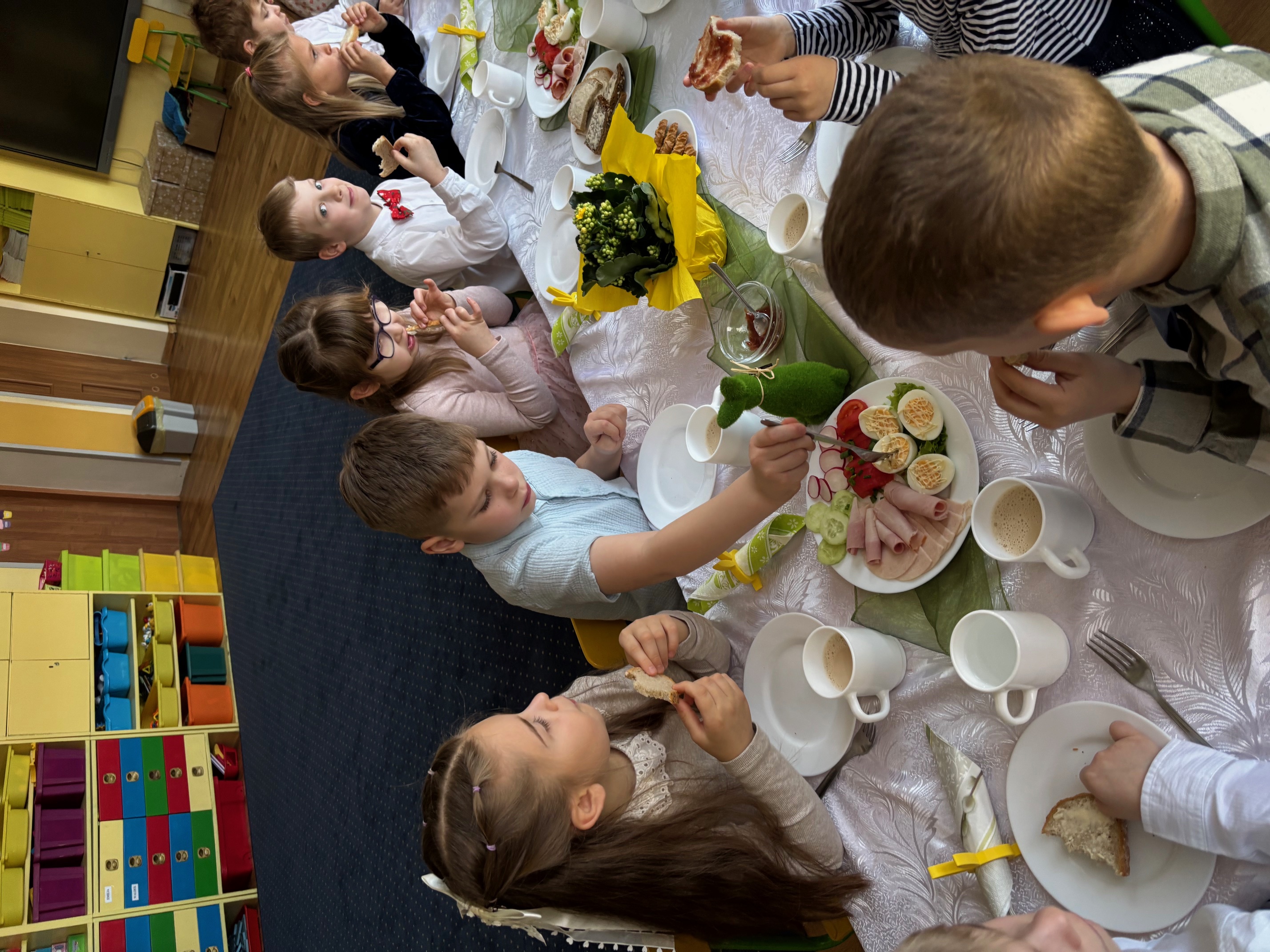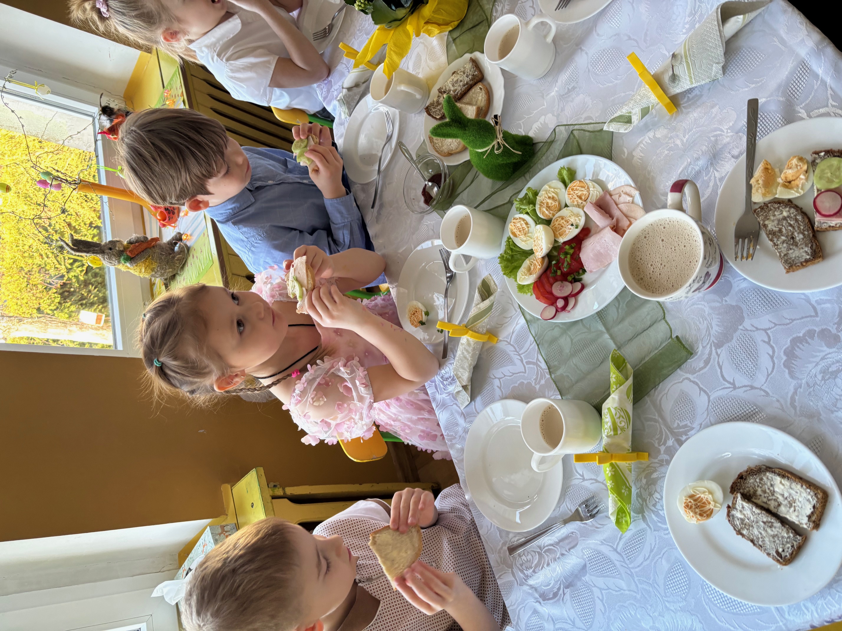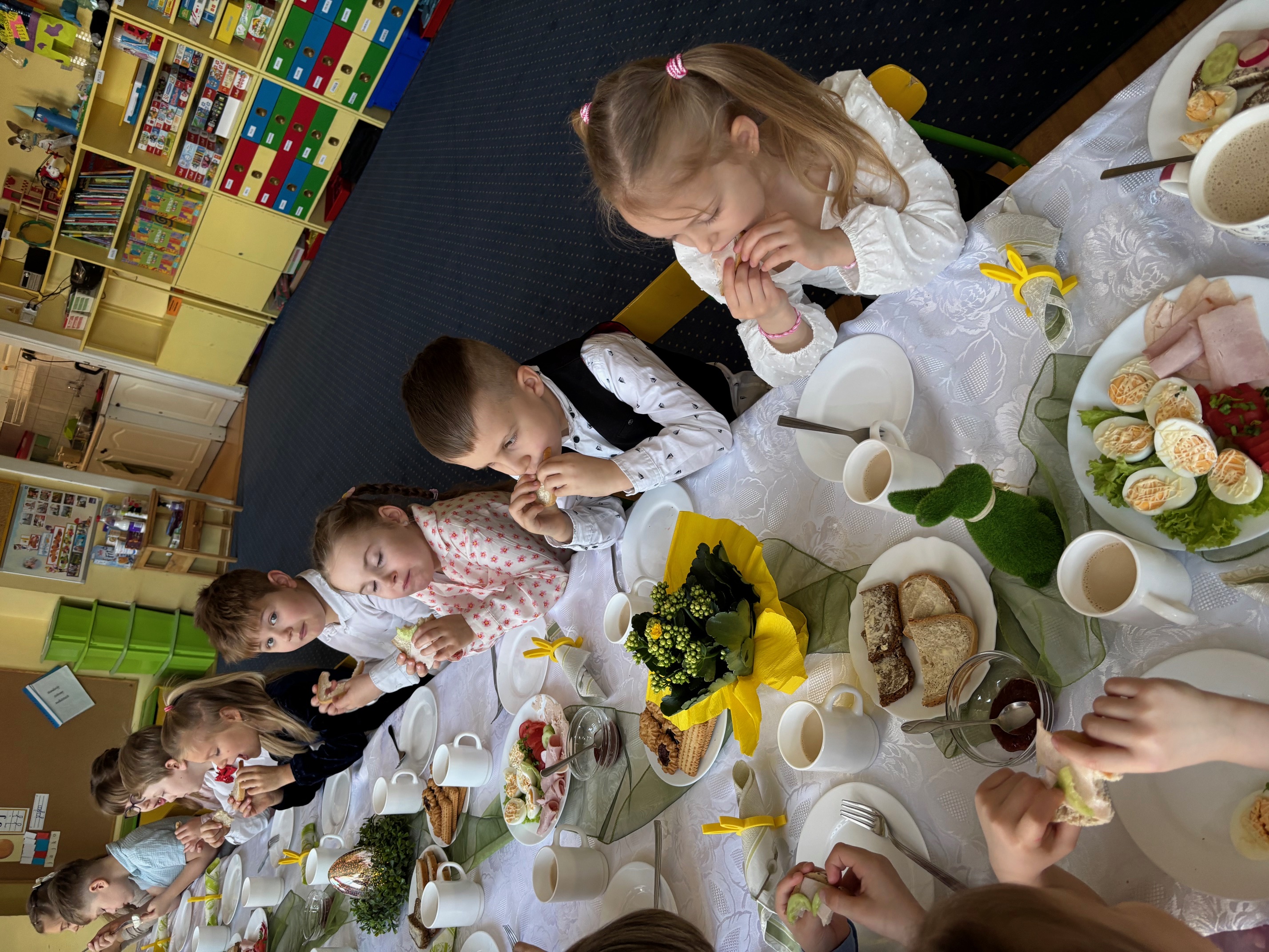 W środę 1 kwietnia w naszym przedszkolu odbyło się uroczyste śniadanie wielkanocne. Na świątecznym stole nie mogło zabraknąć jajka, szyneczki, babki. Po śniadaniu wszystkie grupy wyruszyły na poszukiwanie „prezentów od zajączka” w ogrodzie przedszkolnym.