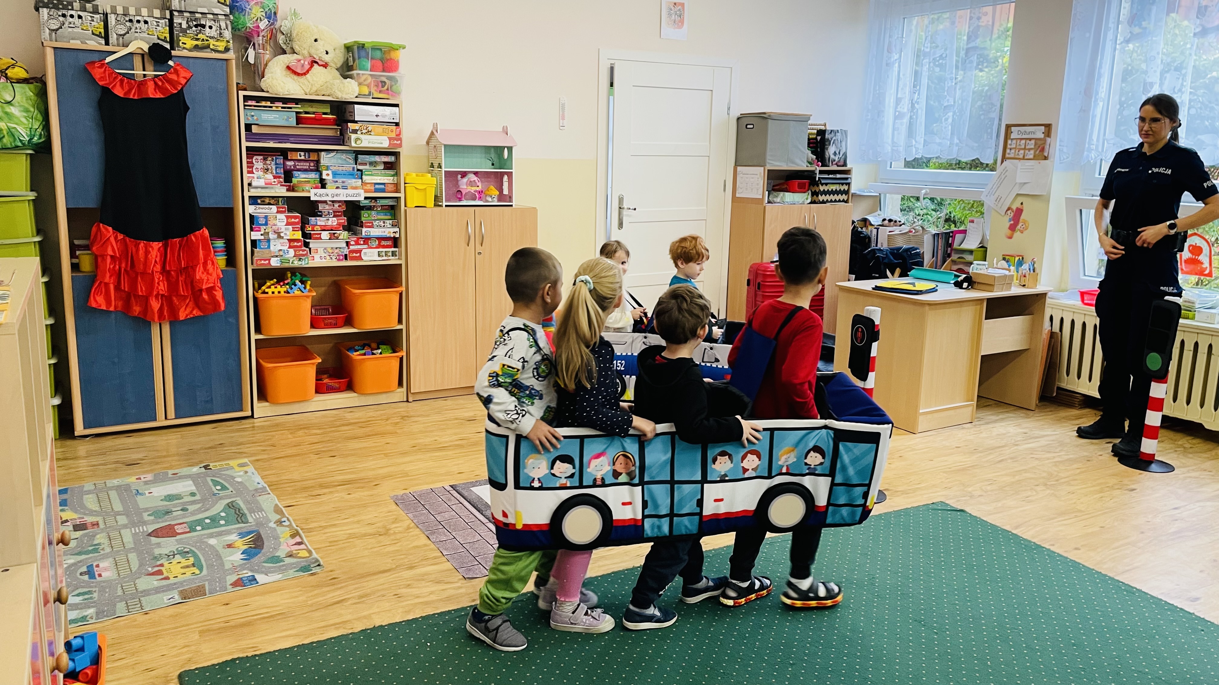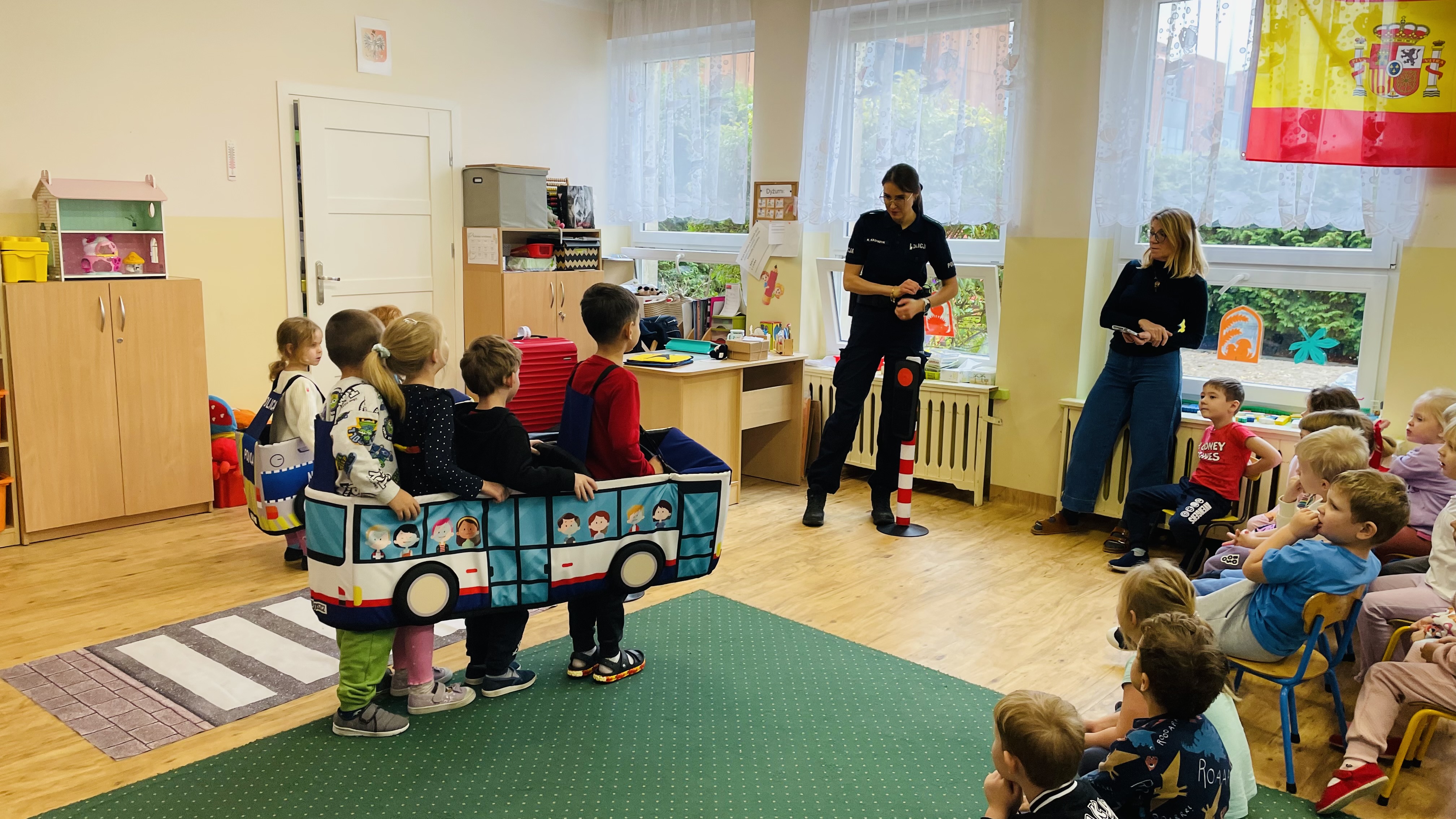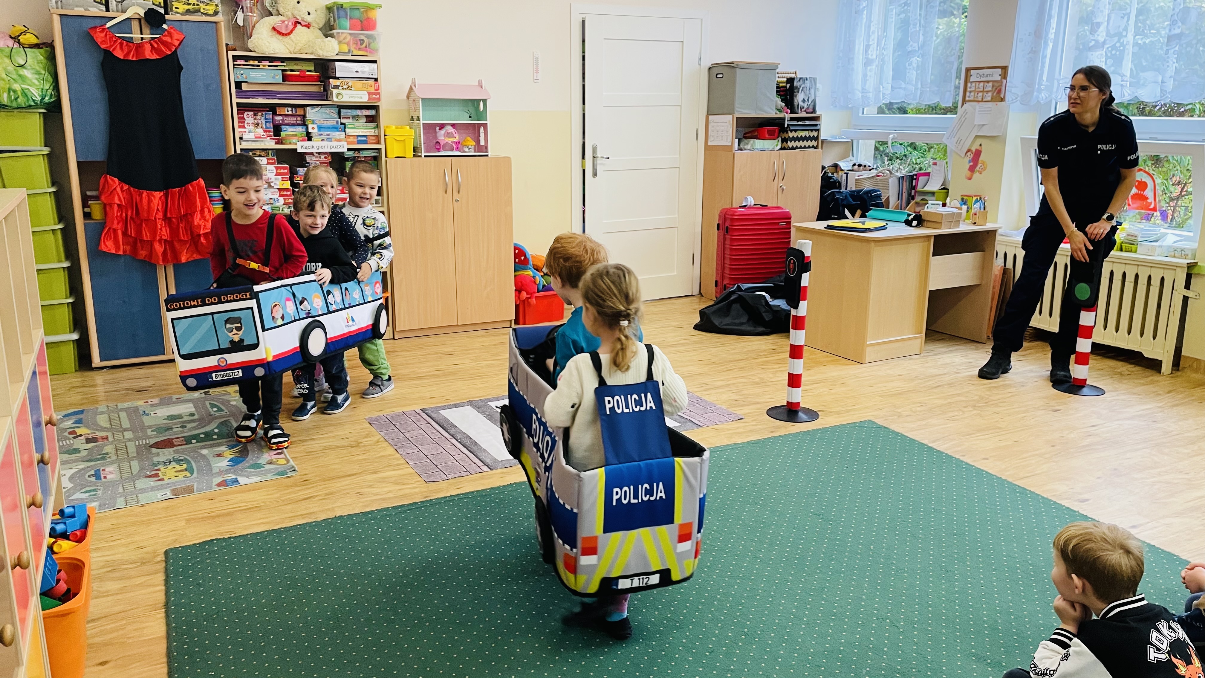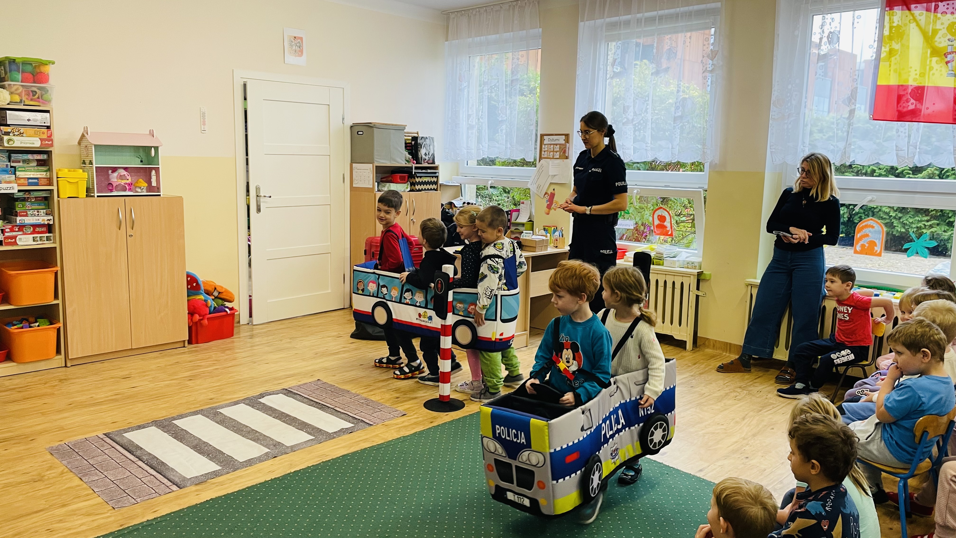 Nasza grupa uczestniczyła w spotkaniu z policjantem. W trakcie spotkania dzieci miały okazję sprawdzić swoją wiedzę na temat bezpieczeństwa na drodze, a także czynnie brać udział w zabawie "Ruch uliczny".