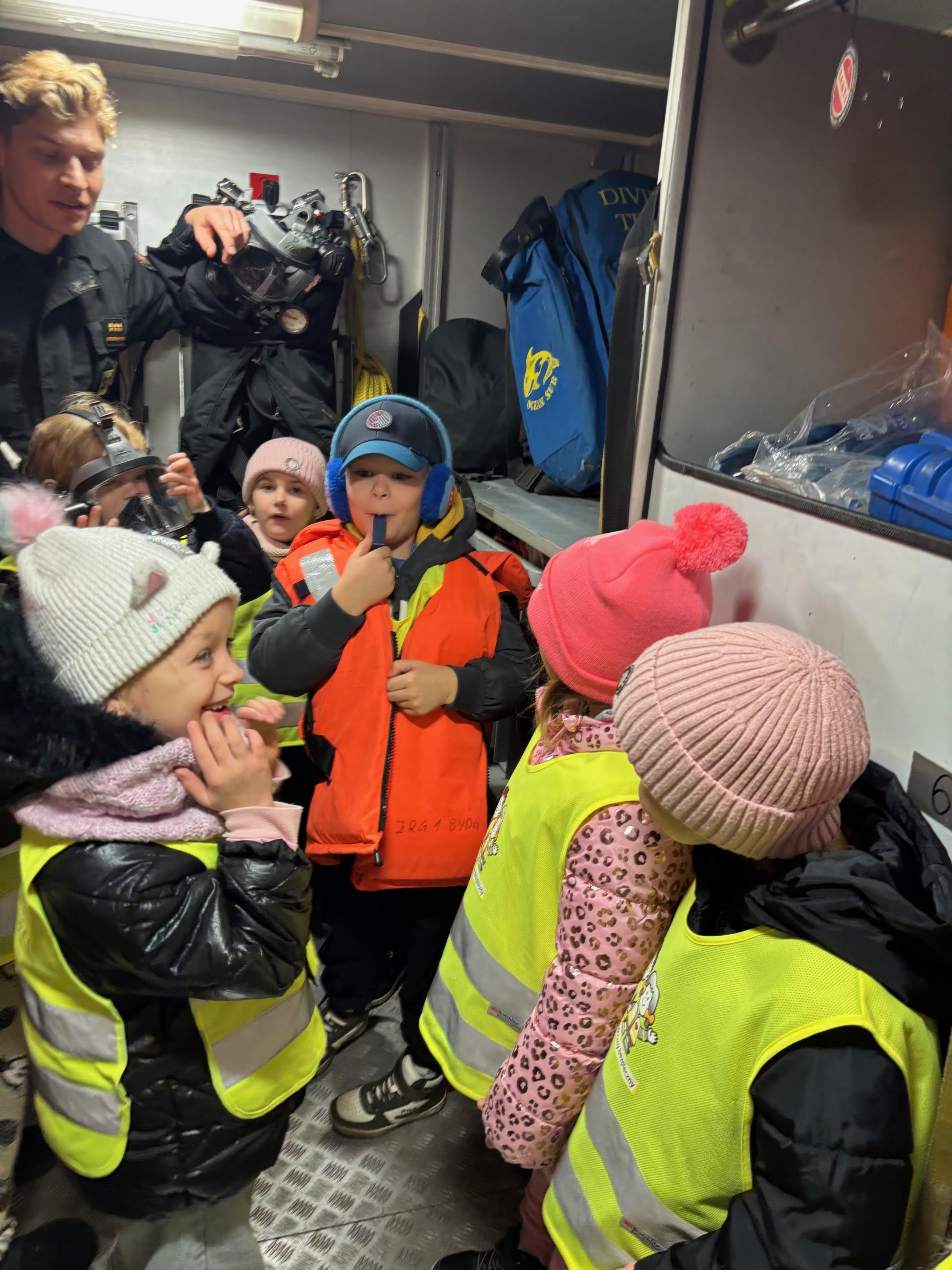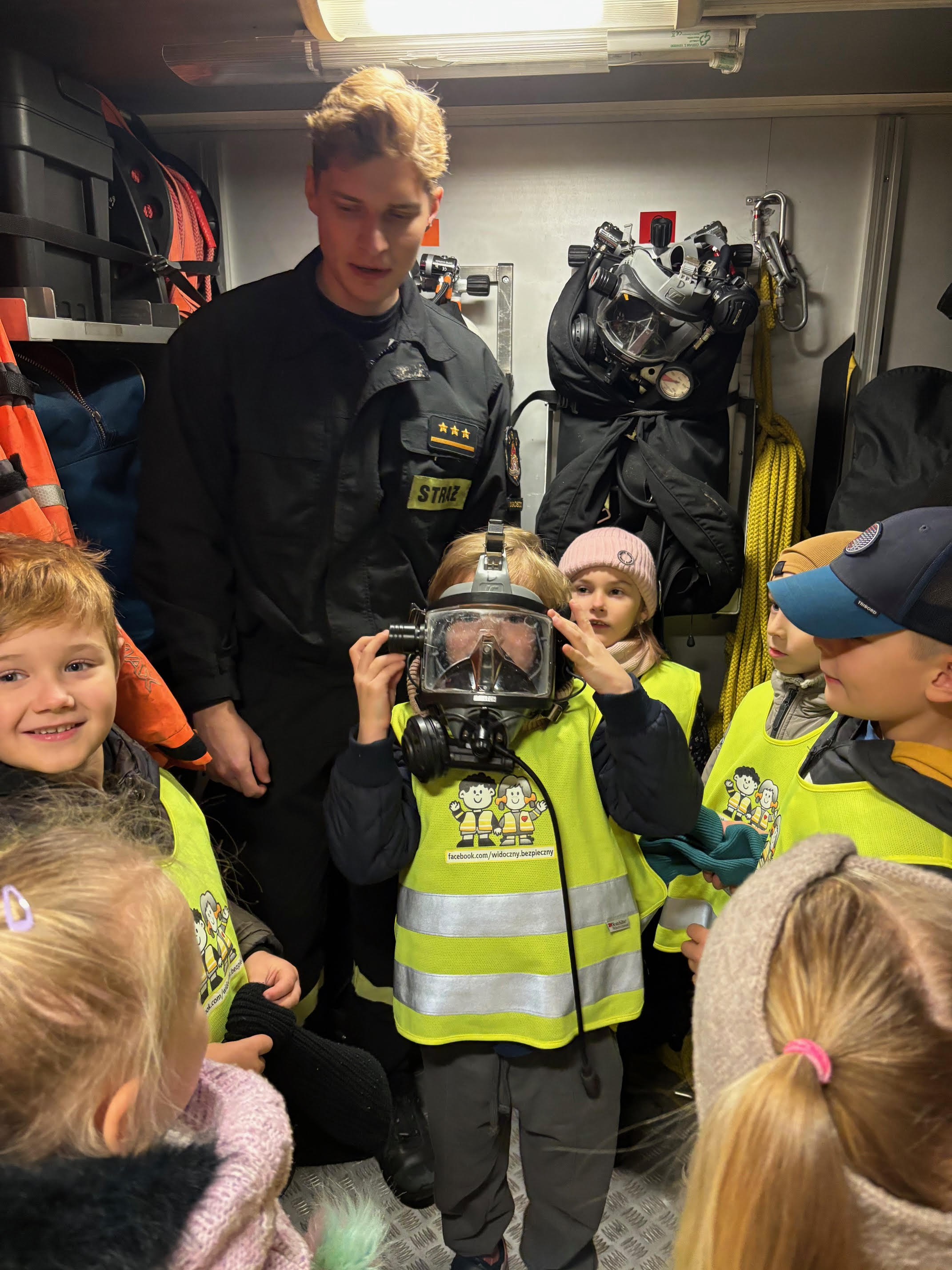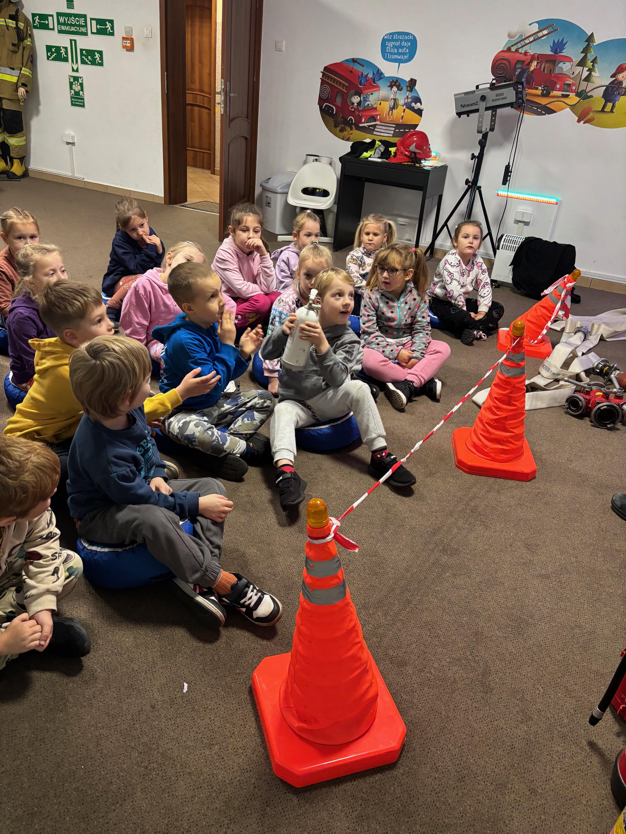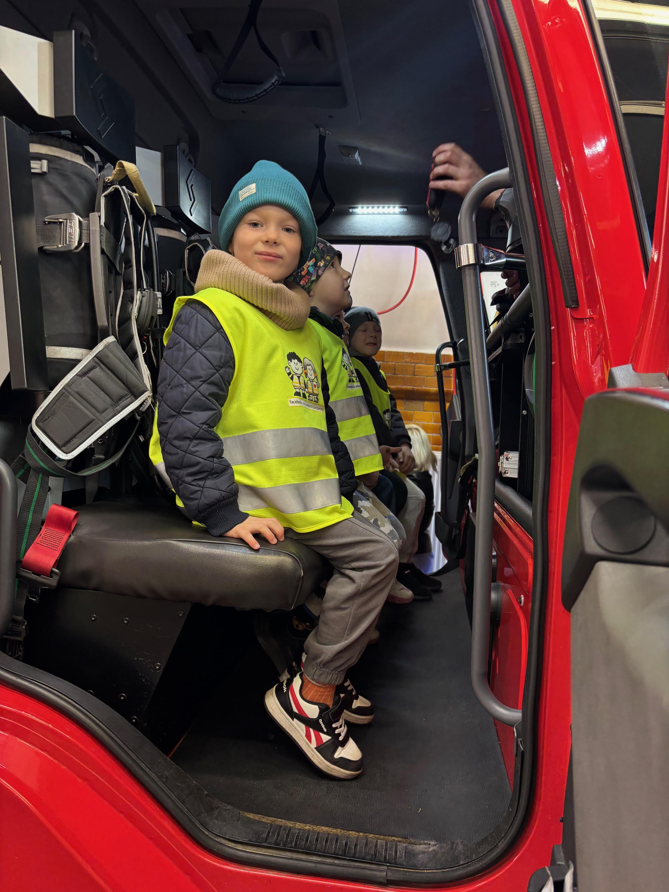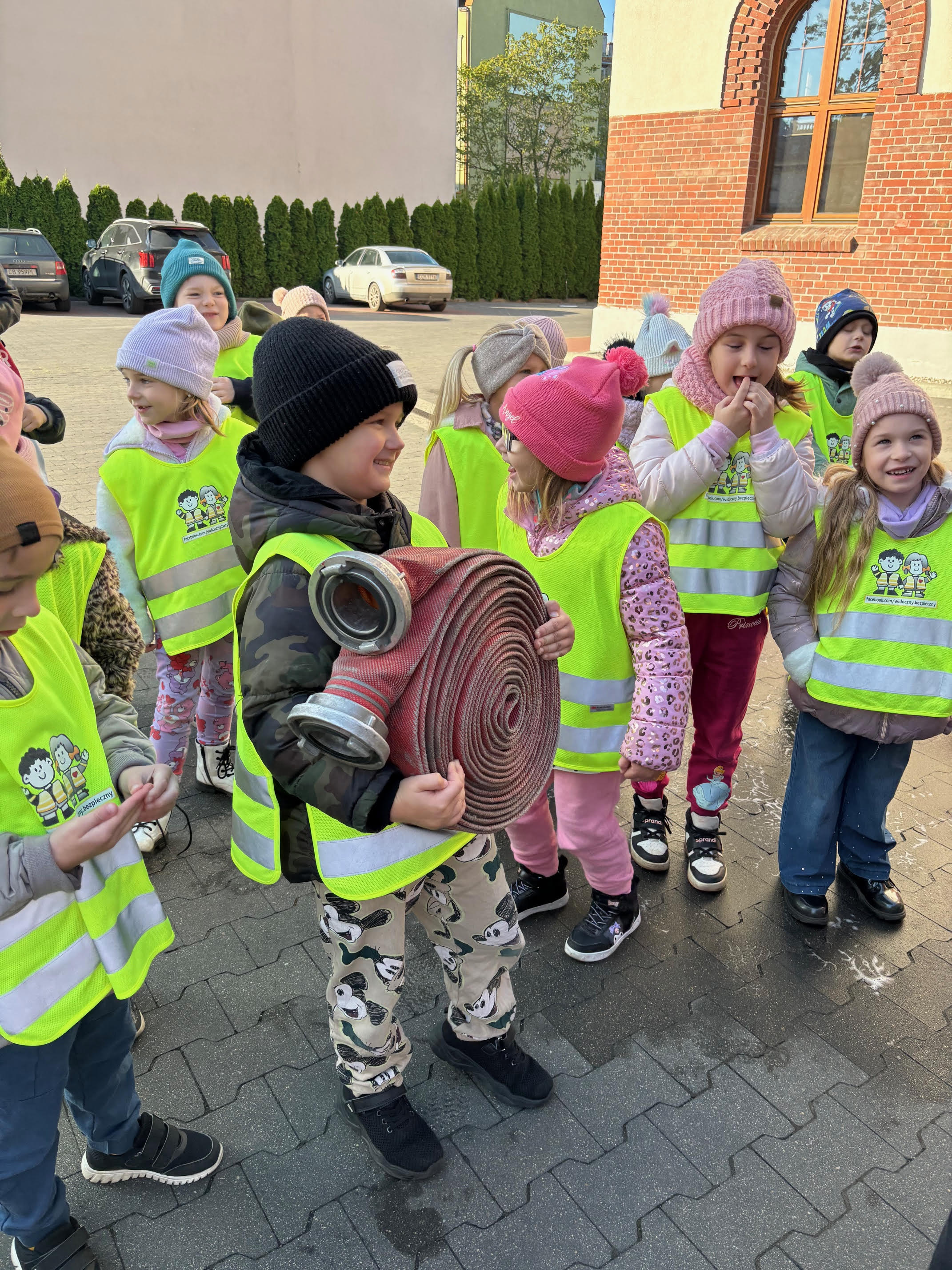 Dzisiaj braliśmy udział w zajęciach edukacyjnych „Ognik" .To program prowadzony przez Państwową Straż Pożarną, mający na celu naukę bezpieczeństwa pożarowego i zasad postępowania. Dzieci uczą się pierwszej pomocy, obsługi sprzętu i zasad ewakuacji, a także mają możliwość przymierzenia strażackiego wyposażenia i wejścia do wozu strażackiego.